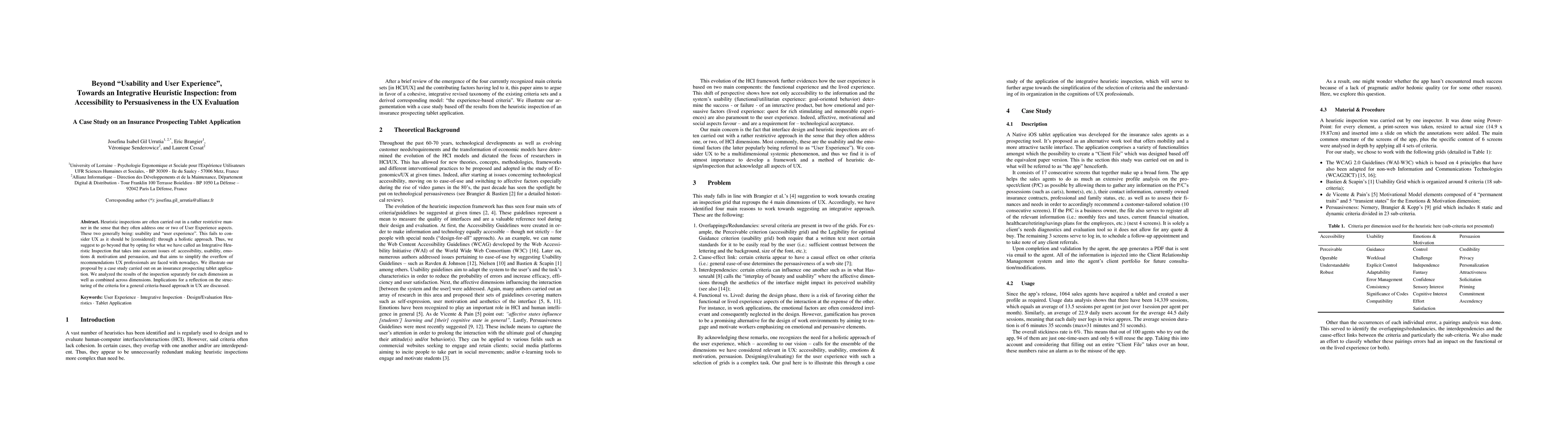 A new approach to usability testing, called Integrative Heuristic Inspection, combines aspects of accessibility, usability, emotions, motivation, and persuasion to evaluate user experience. This method is illustrated through a case study on an insurance prospecting tablet application.