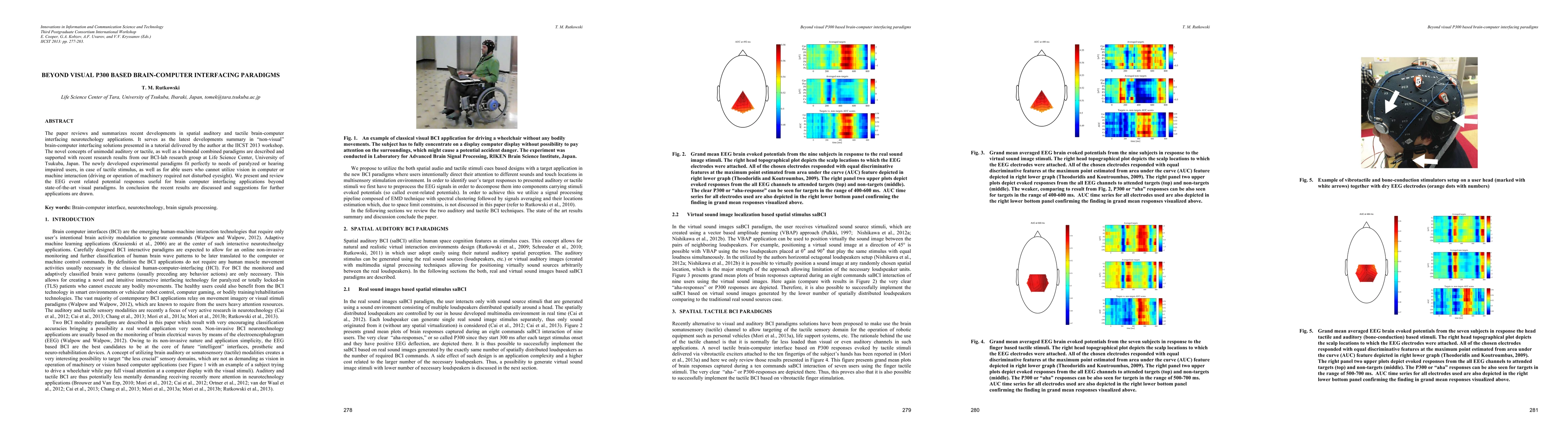The paper reviews and summarizes recent developments in spatial auditory and tactile brain-computer interfacing neurotechology applications. It serves as the latest developments summary in "non-visual" brain-computer interfacing solutions presented in a tutorial delivered by the author at the IICST 2013 workshop. The novel concepts of unimodal auditory or tactile, as well as a bimodal combined paradigms are described and supported with recent research results from our BCI-lab research group at Life Science Center, University of Tsukuba, Japan. The newly developed experimental paradigms fit perfectly to needs of paralyzed or hearing impaired users, in case of tactile stimulus, as well as for able users who cannot utilize vision in computer or machine interaction (driving or operation of machinery required not disturbed eyesight). We present and review the EEG event related potential responses useful for brain computer interfacing applications beyond state-of-the-art visual paradigms. In conclusion the recent results are discussed and suggestions for further applications are drawn.