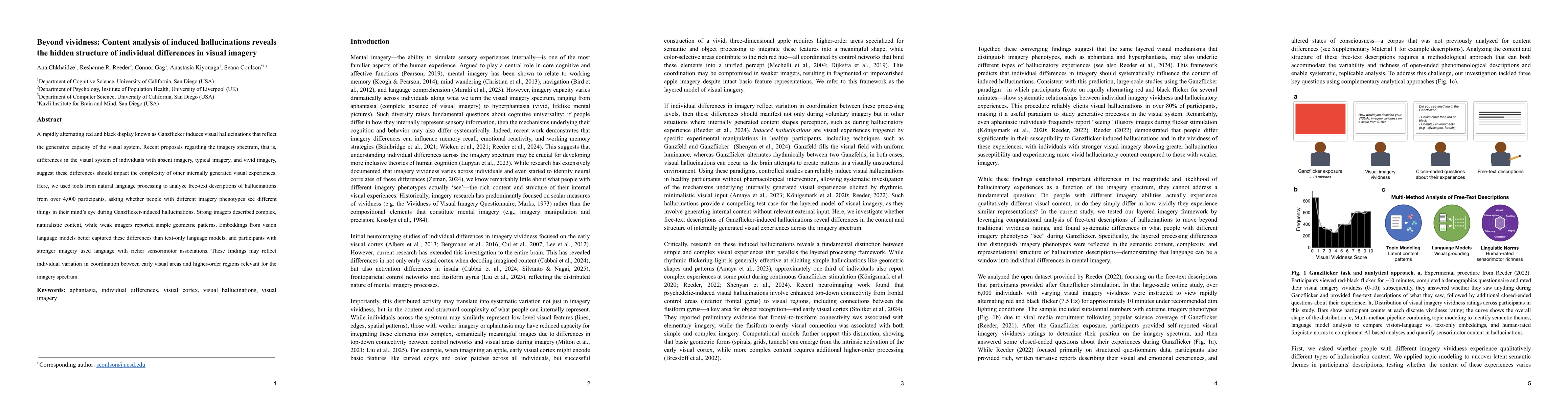 A rapidly alternating red and black display known as Ganzflicker induces visual hallucinations that reflect the generative capacity of the visual system. Recent proposals regarding the imagery spectrum, that is, differences in the visual system of individuals with absent imagery, typical imagery, and vivid imagery, suggest these differences should impact the complexity of other internally generated visual experiences. Here, we used tools from natural language processing to analyze free-text descriptions of hallucinations from over 4,000 participants, asking whether people with different imagery phenotypes see different things in their mind's eye during Ganzflicker-induced hallucinations. Strong imagers described complex, naturalistic content, while weak imagers reported simple geometric patterns. Embeddings from vision language models better captured these differences than text-only language models, and participants with stronger imagery used language with richer sensorimotor associations. These findings may reflect individual variation in coordination between early visual areas and higher-order regions relevant for the imagery spectrum.