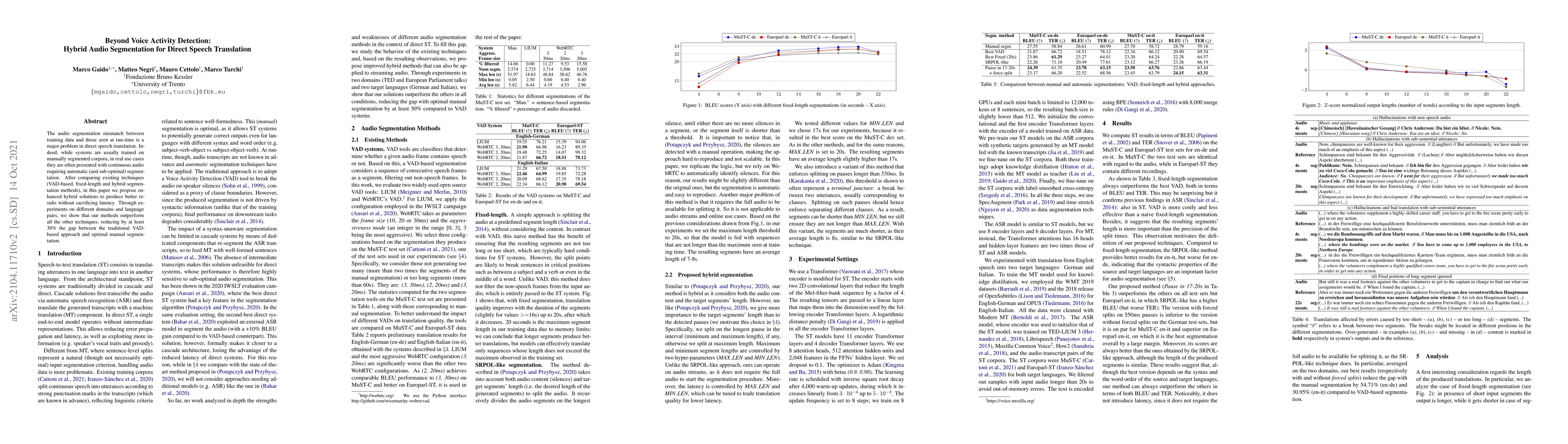 This paper proposes advanced hybrid audio segmentation techniques to address the mismatch between training and real-time data in direct speech translation, achieving better results than traditional VAD-based methods and fixed-length segmentation, with a 30% reduction in performance gap.