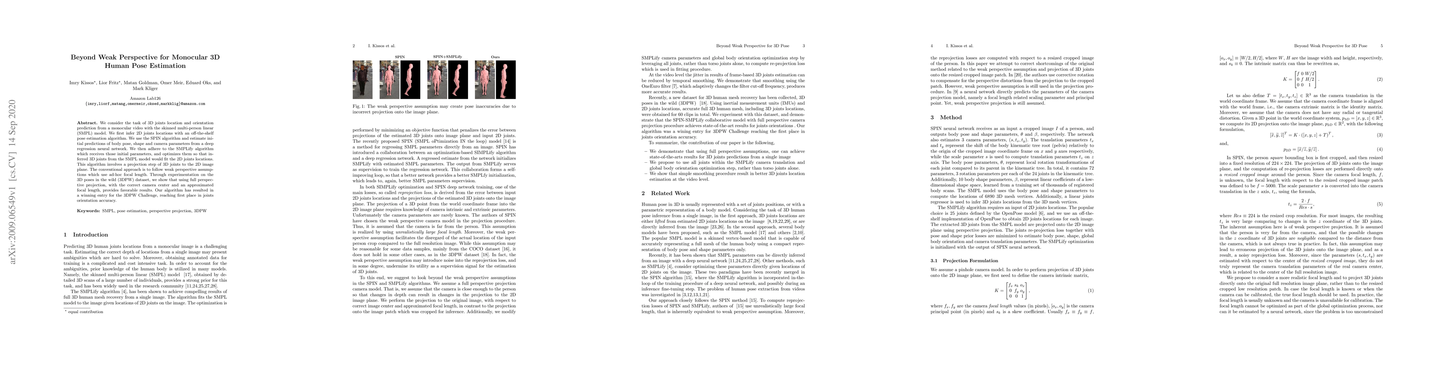 We consider the task of 3D joints location and orientation prediction from a monocular video with the skinned multi-person linear (SMPL) model. We first infer 2D joints locations with an off-the-shelf pose estimation algorithm. We use the SPIN algorithm and estimate initial predictions of body pose, shape and camera parameters from a deep regression neural network. We then adhere to the SMPLify algorithm which receives those initial parameters, and optimizes them so that inferred 3D joints from the SMPL model would fit the 2D joints locations. This algorithm involves a projection step of 3D joints to the 2D image plane. The conventional approach is to follow weak perspective assumptions which use ad-hoc focal length. Through experimentation on the 3D Poses in the Wild (3DPW) dataset, we show that using full perspective projection, with the correct camera center and an approximated focal length, provides favorable results. Our algorithm has resulted in a winning entry for the 3DPW Challenge, reaching first place in joints orientation accuracy.