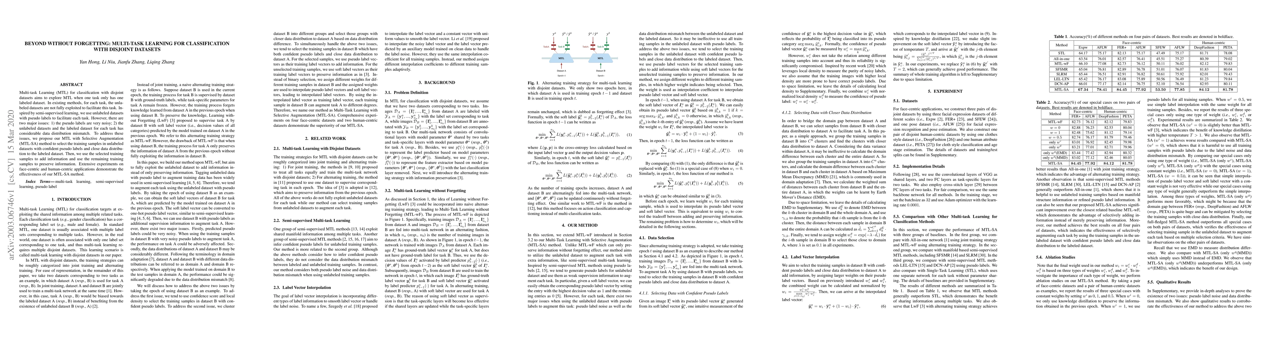 This paper proposes MTL-SA, a Multi-Task Learning method for classification with disjoint datasets, addressing noisy pseudo labels and data distribution mismatch by selectively augmenting training samples from unlabeled datasets with confident pseudo labels and close data distribution to the labeled dataset. Experiments show the method's effectiveness in face-centric and human-centric applications.