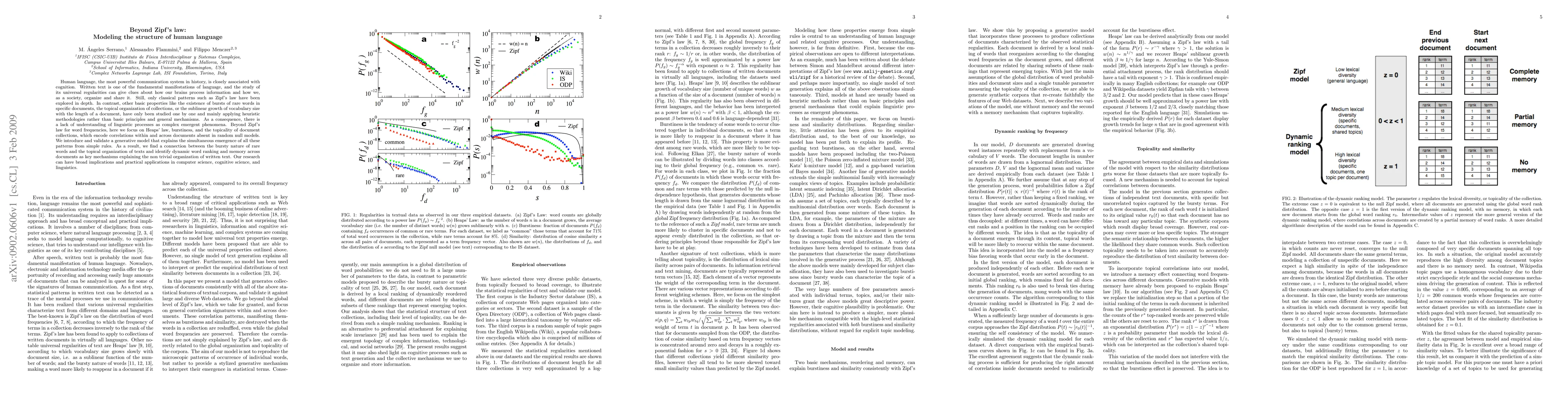 This paper explores the complex structures of human language beyond Zipf's law, focusing on Heaps' law, word burstiness, and document topicality. It introduces a generative model that explains the simultaneous emergence of these patterns, revealing dynamic word ranking and memory as key mechanisms behind the organization of written text.