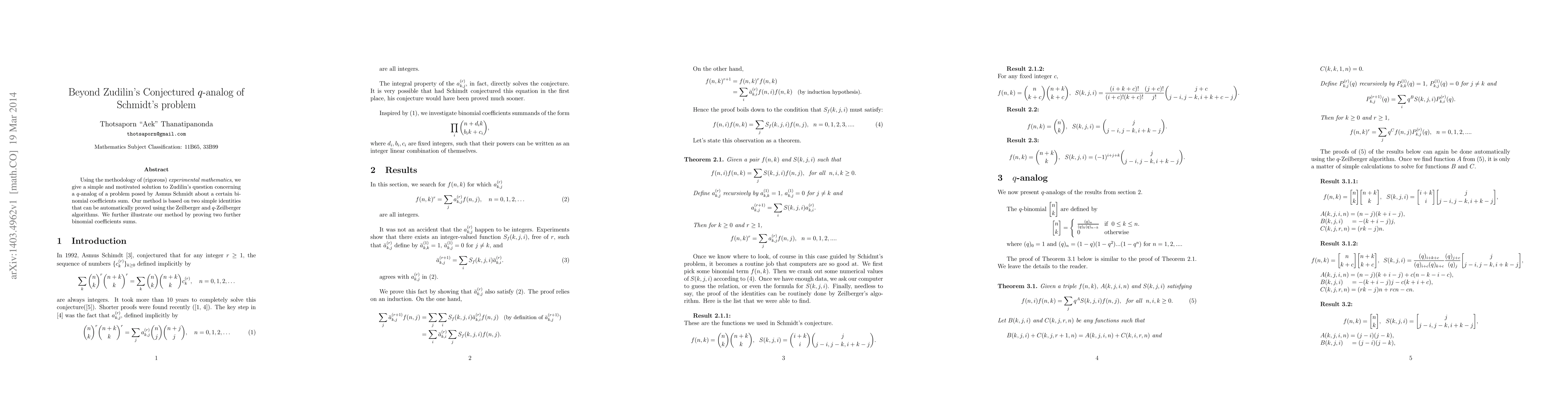 Using the methodology of (rigorous) {\it experimental mathematics}, we give a simple and motivated solution to Zudilin's question concerning a $q$-analog of a problem posed by Asmus Schmidt about a certain binomial coefficients sum. Our method is based on two simple identities that can be automatically proved using the Zeilberger and $q$-Zeilberger algorithms. We further illustrate our method by proving two further binomial coefficients sums.