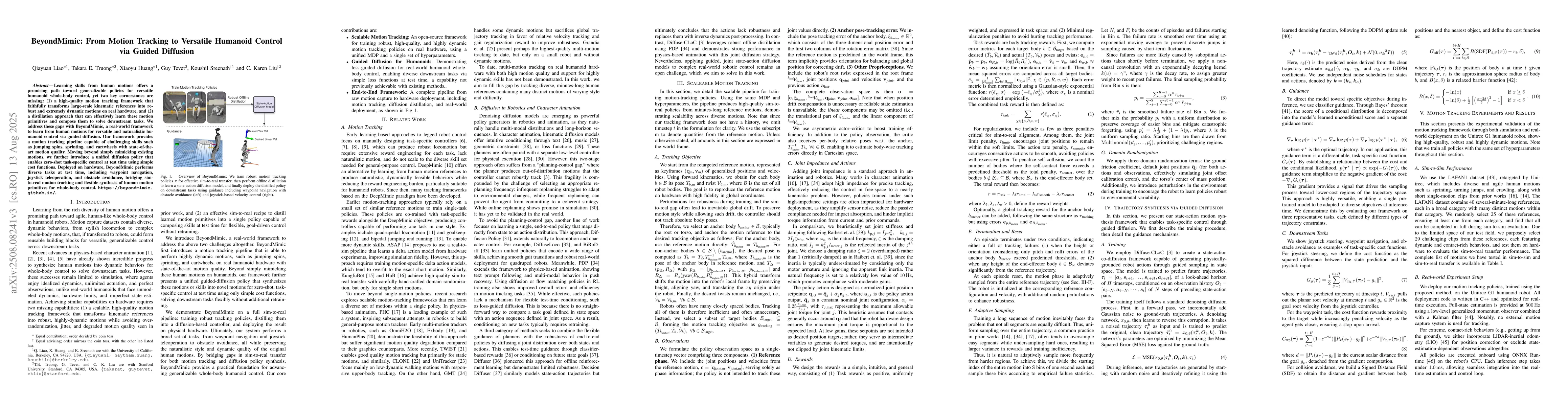 The research introduces BeyondMimic, a framework that combines high-quality motion tracking with guided diffusion for versatile humanoid control, learning from human motions to perform tasks like navigation, teleoperation, and obstacle avoidance.