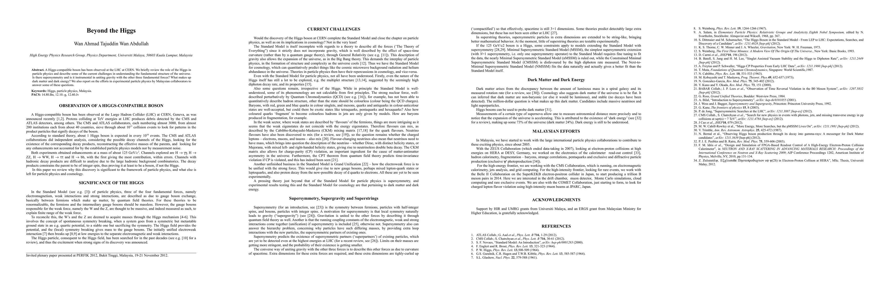 A Higgs-compatible boson has been discovered at the LHC, CERN, affirming the Higgs' role in particle physics. The paper discusses ongoing challenges like unifying gravity with other forces, understanding dark matter/energy, and hints at Malaysian experimental contributions to these quests.
