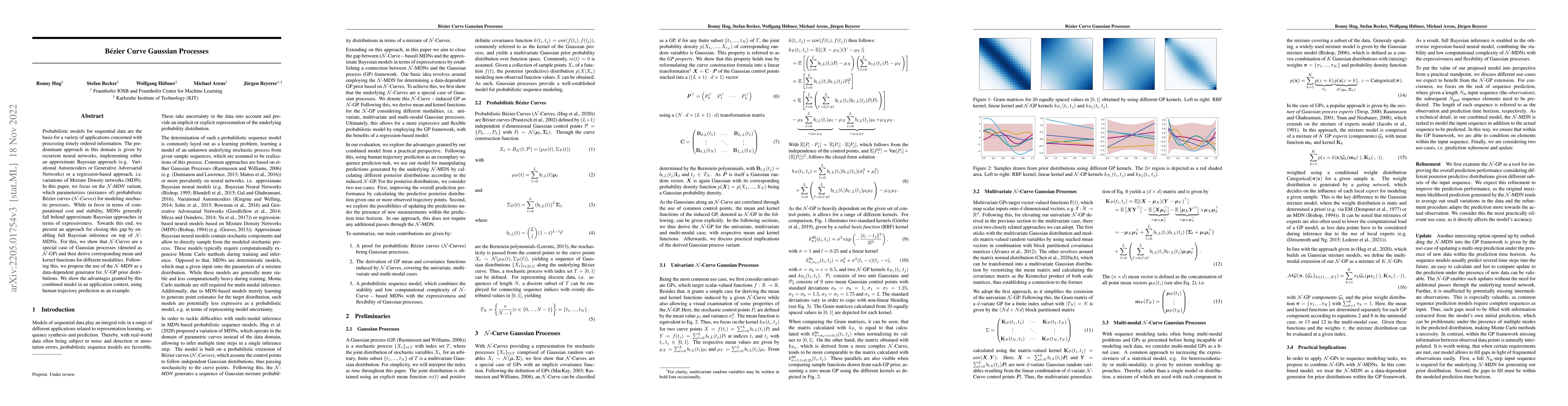 Probabilistic models for sequential data are the basis for a variety of applications concerned with processing timely ordered information. The predominant approach in this domain is given by recurrent neural networks, implementing either an approximate Bayesian approach (e.g. Variational Autoencoders or Generative Adversarial Networks) or a regression-based approach, i.e. variations of Mixture Density networks (MDN). In this paper, we focus on the $\mathcal{N}$-MDN variant, which parameterizes (mixtures of) probabilistic B\'ezier curves ($\mathcal{N}$-Curves) for modeling stochastic processes. While in favor in terms of computational cost and stability, MDNs generally fall behind approximate Bayesian approaches in terms of expressiveness. Towards this end, we present an approach for closing this gap by enabling full Bayesian inference on top of $\mathcal{N}$-MDNs. For this, we show that $\mathcal{N}$-Curves are a special case of Gaussian processes (denoted as $\mathcal{N}$-GP) and then derive corresponding mean and kernel functions for different modalities. Following this, we propose the use of the $\mathcal{N}$-MDN as a data-dependent generator for $\mathcal{N}$-GP prior distributions. We show the advantages granted by this combined model in an application context, using human trajectory prediction as an example.