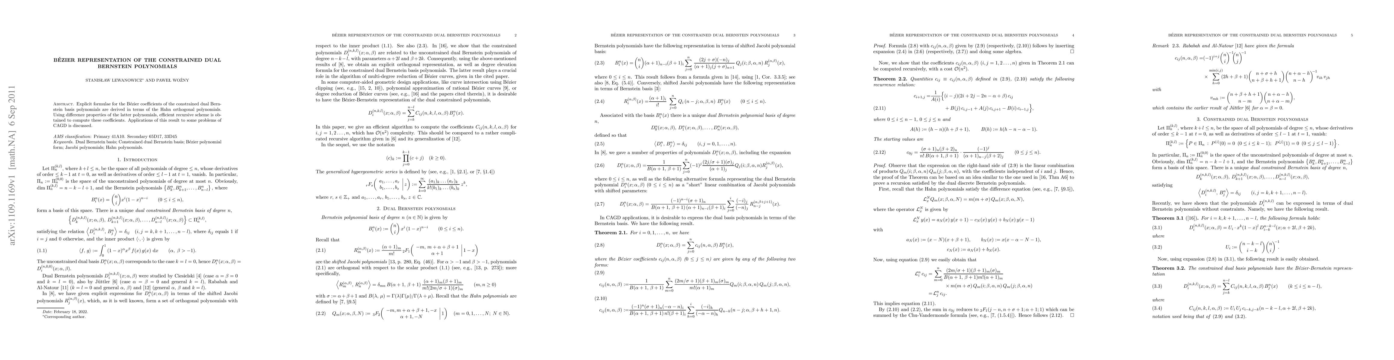 This paper derives explicit B\'ezier coefficients for constrained dual Bernstein basis polynomials in terms of Hahn orthogonal polynomials, and presents a recursive scheme for efficient computation. The method's applications to computational geometry and algebraic geometry are also explored.