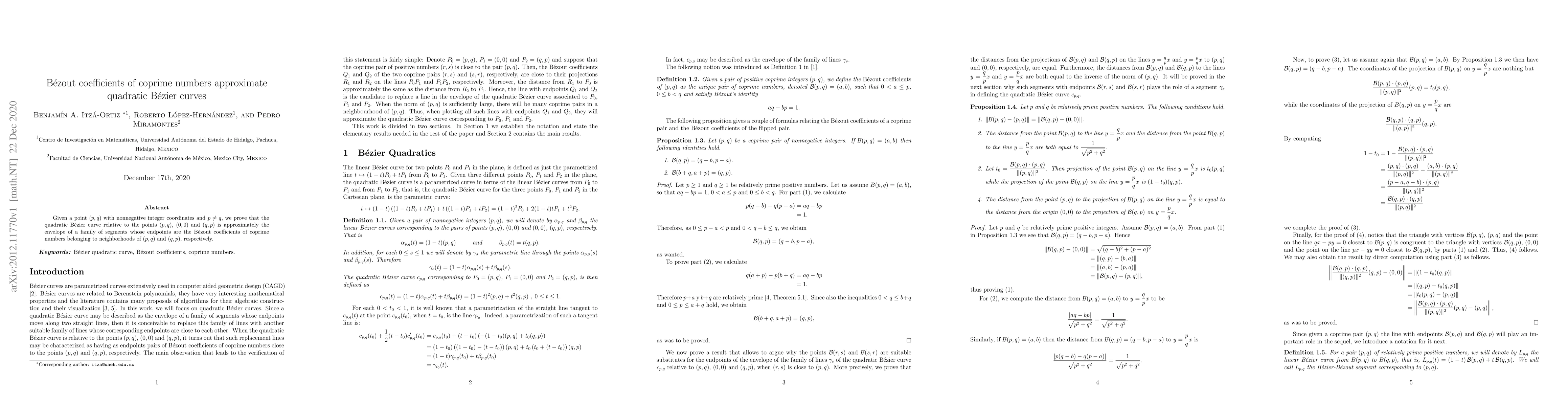 Summary: This research demonstrates that quadratic B\'ezier curves based on specific integer points approximate the envelope of segments defined by B\'ezout coefficients of coprime numbers near given coordinates. It establishes a connection between number theory and geometric approximation.