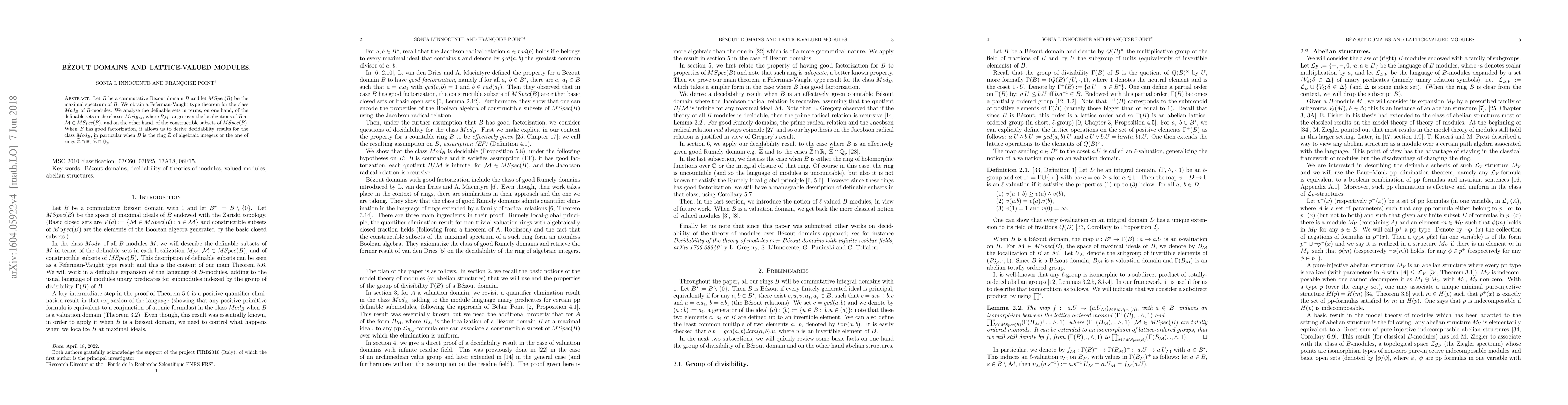 This paper establishes a Feferman-Vaught theorem for B\'ezout domains, analyzing definable sets in B-modules through localizations and constructible subsets of the maximal spectrum. It also derives decidability results for B-modules when B is a ring of algebraic integers or its intersections with real or p-adic numbers.