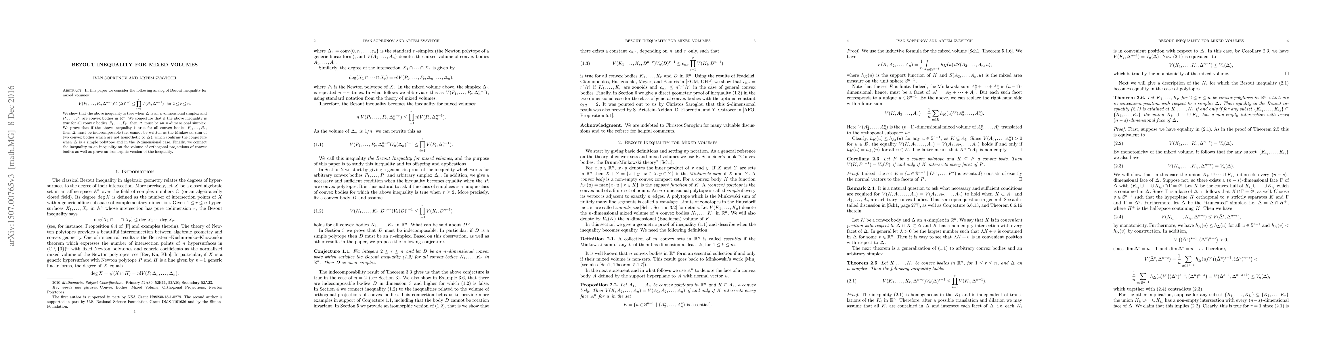 In this paper we consider the following analog of Bezout inequality for mixed volumes: $$V(P_1,\dots,P_r,\Delta^{n-r})V_n(\Delta)^{r-1}\leq \prod_{i=1}^r V(P_i,\Delta^{n-1})\ \text{ for }2\leq r\leq n.$$ We show that the above inequality is true when $\Delta$ is an $n$-dimensional simplex and $P_1, \dots, P_r$ are convex bodies in $\mathbb{R}^n$. We conjecture that if the above inequality is true for all convex bodies $P_1, \dots, P_r$, then $\Delta$ must be an $n$-dimensional simplex. We prove that if the above inequality is true for all convex bodies $P_1, \dots, P_r$, then $\Delta$ must be indecomposable (i.e. cannot be written as the Minkowski sum of two convex bodies which are not homothetic to $\Delta$), which confirms the conjecture when $\Delta$ is a simple polytope and in the 2-dimensional case. Finally, we connect the inequality to an inequality on the volume of orthogonal projections of convex bodies as well as prove an isomorphic version of the inequality.