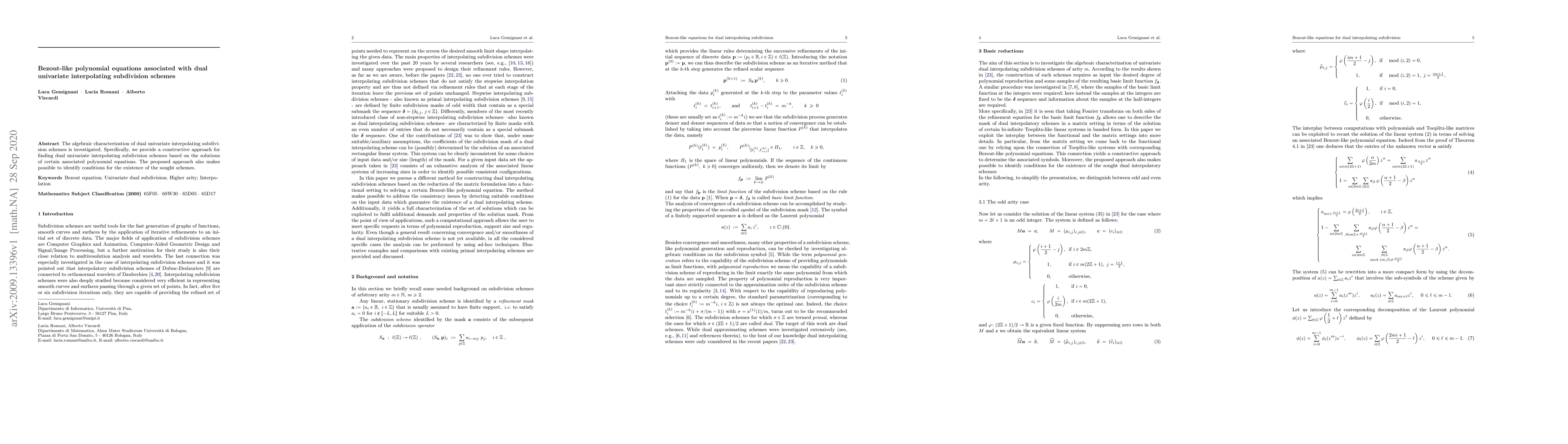 This paper investigates the algebraic properties of dual univariate interpolating subdivision schemes, presenting a method to construct these schemes through solutions of specific Bezout-like polynomial equations, and identifying conditions for their existence.