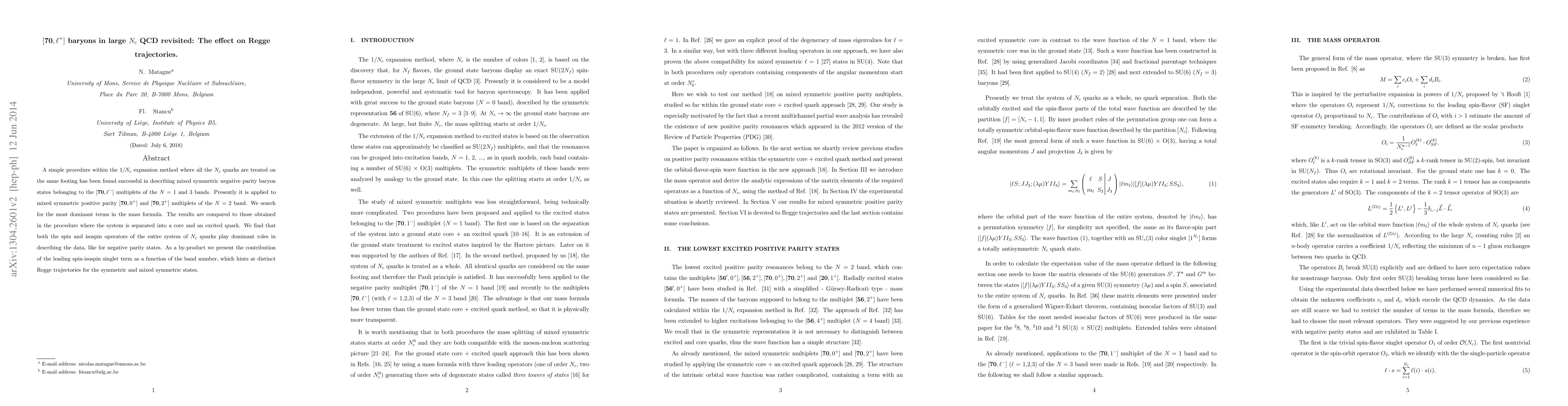 This paper revisits the $[{\bf 70, \ell^+}]$ baryons in large $N_c$ QCD using the $1/N_c$ expansion method, finding that both spin and isospin operators of the entire quark system are crucial for describing the mass formula. It reveals distinct Regge trajectories for symmetric and mixed symmetric states, hinting at different behaviors in baryon states.
