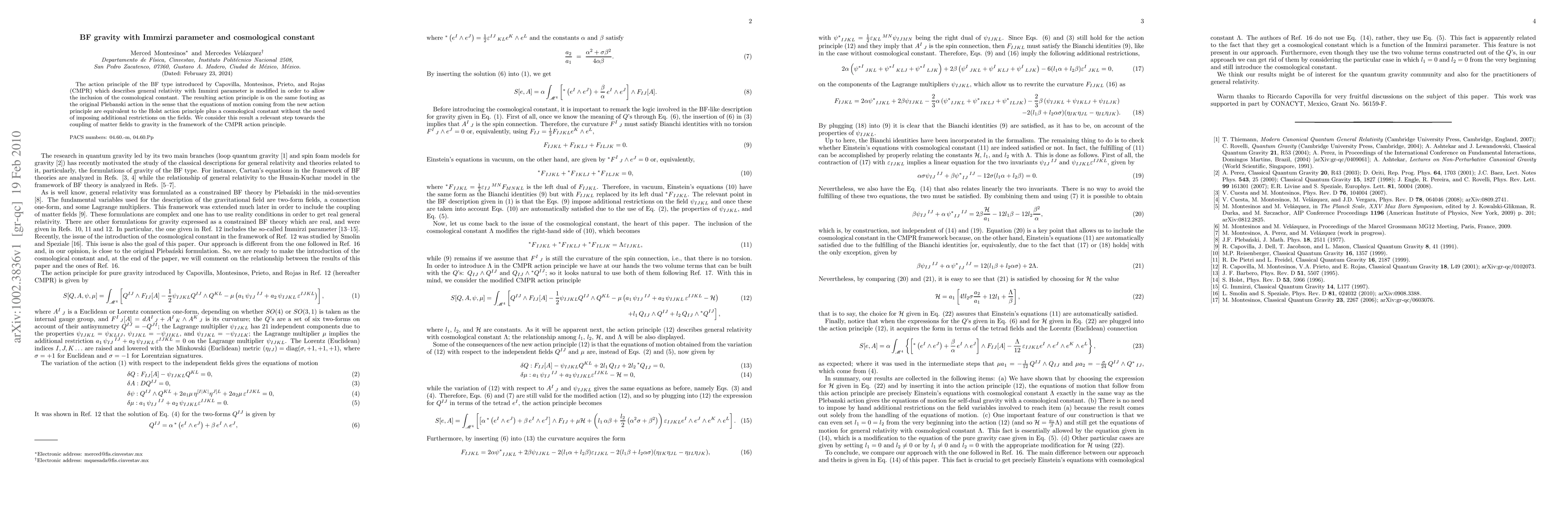 The action principle of the BF type introduced by Capovilla, Montesinos, Prieto, and Rojas (CMPR) which describes general relativity with Immirzi parameter is modified in order to allow the inclusion of the cosmological constant. The resulting action principle is on the same footing as the original Plebanski action in the sense that the equations of motion coming from the new action principle are equivalent to the Holst action principle plus a cosmological constant without the need of imposing additional restrictions on the fields. We consider this result a relevant step towards the coupling of matter fields to gravity in the framework of the CMPR action principle.