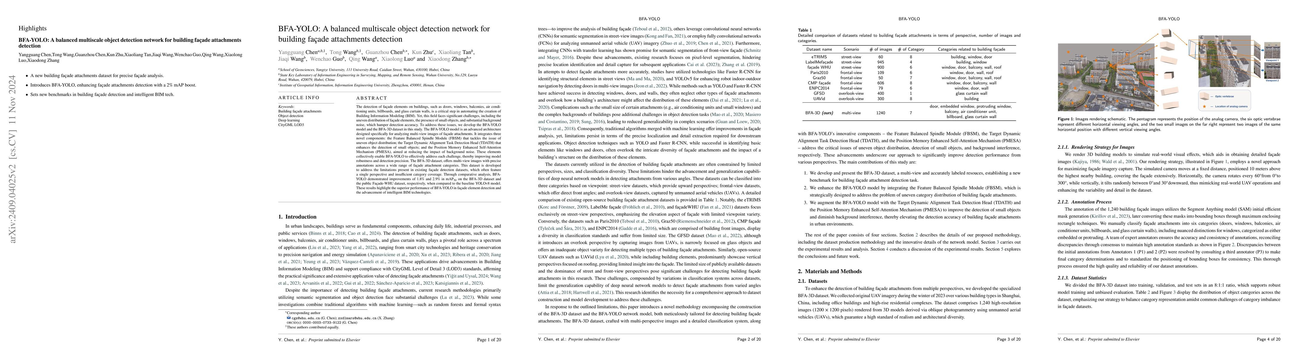 BFA-YOLO proposes a novel object detection network to tackle the challenges of detecting building facade attachments in multi-view images, employing innovations like FBSM, TDATH, and PMESA to address uneven distribution, small object detection, and background interference. A new BFA-3D dataset with multi-view, diverse categories, and detailed labels was constructed to enhance model training, achieving superior detection performance compared to YOLOv8.
