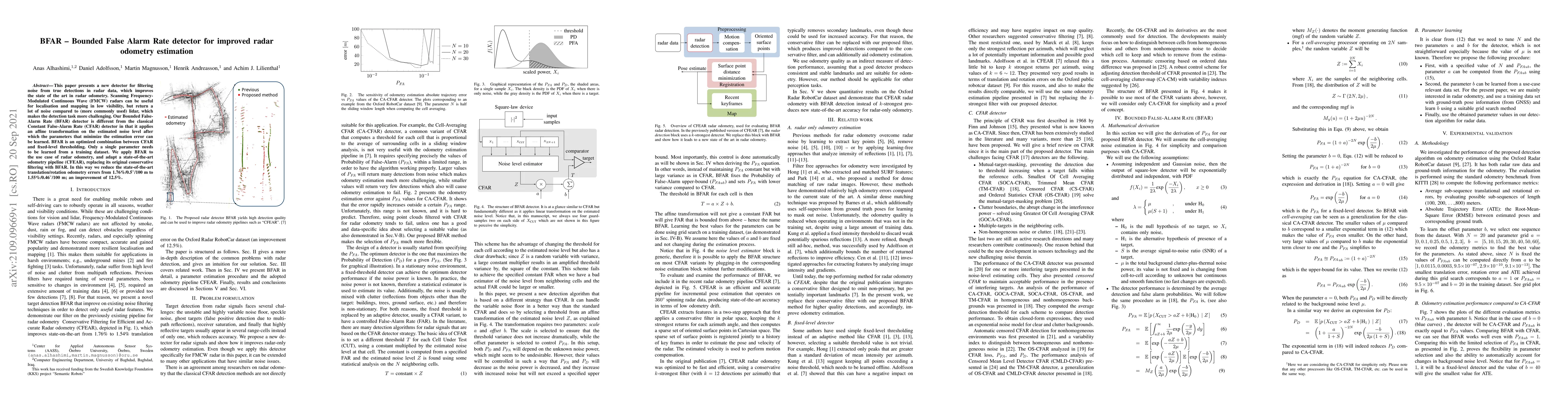 This paper introduces a BFAR detector to filter noise in FMCW radar data, enhancing radar odometry accuracy. The BFAR detector, which combines aspects of CFAR and fixed-level thresholding, reduces odometry errors by 12.5% compared to the existing CFEAR method.