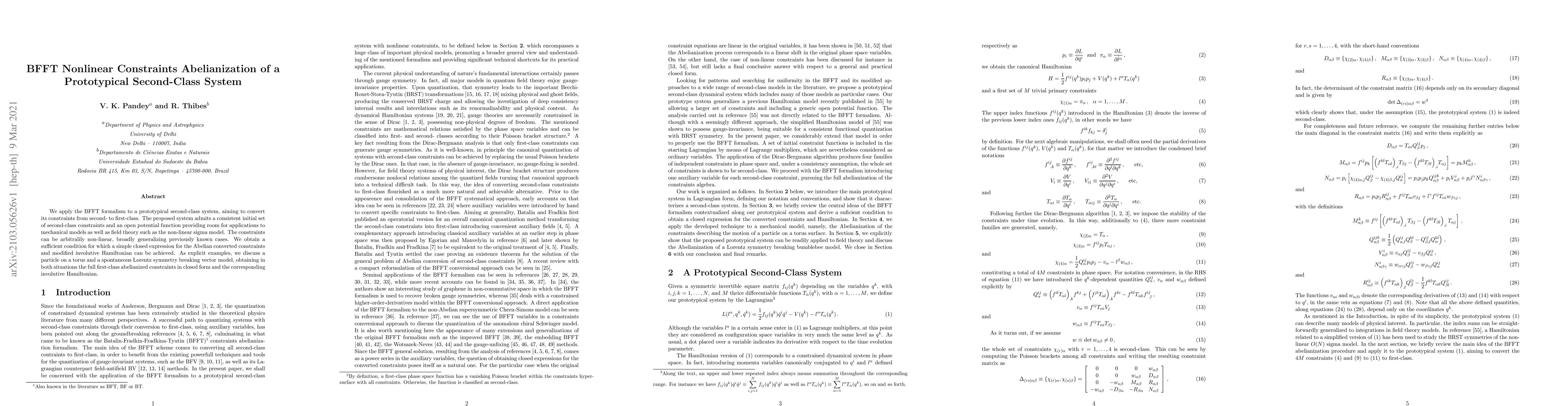 This paper applies the BFFT formalism to a prototypical second-class system to convert its constraints to first-class, achieving Abelianization through a sufficient condition. Examples include a particle on a torus and a spontaneous Lorentz symmetry breaking vector model, both yielding first-class abelianized constraints and modified Hamiltonians.