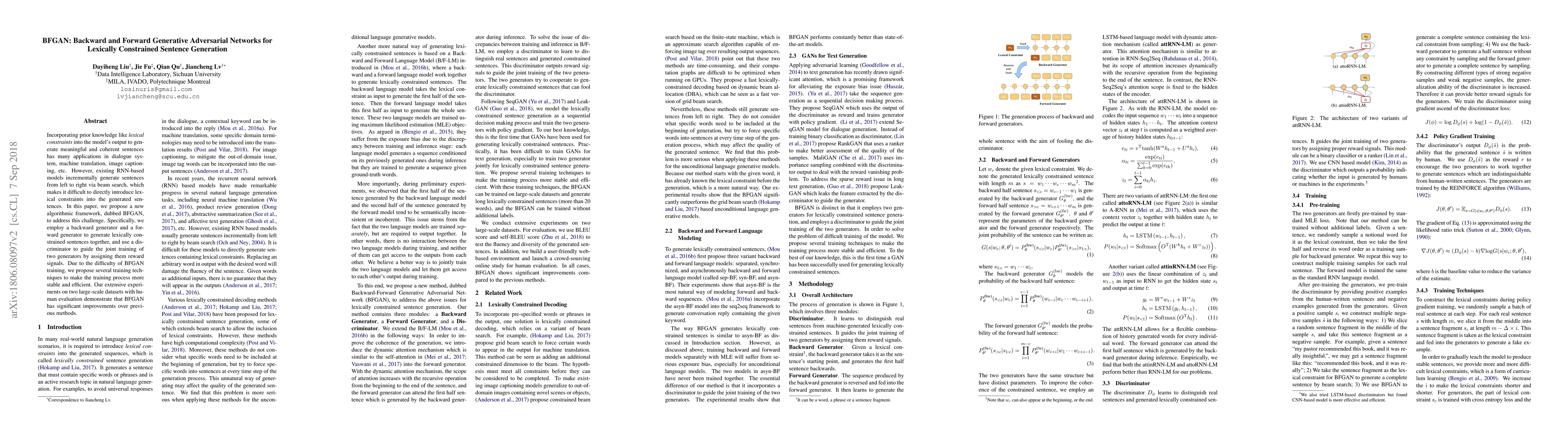 Incorporating prior knowledge like lexical constraints into the model's output to generate meaningful and coherent sentences has many applications in dialogue system, machine translation, image captioning, etc. However, existing RNN-based models incrementally generate sentences from left to right via beam search, which makes it difficult to directly introduce lexical constraints into the generated sentences. In this paper, we propose a new algorithmic framework, dubbed BFGAN, to address this challenge. Specifically, we employ a backward generator and a forward generator to generate lexically constrained sentences together, and use a discriminator to guide the joint training of two generators by assigning them reward signals. Due to the difficulty of BFGAN training, we propose several training techniques to make the training process more stable and efficient. Our extensive experiments on two large-scale datasets with human evaluation demonstrate that BFGAN has significant improvements over previous methods.