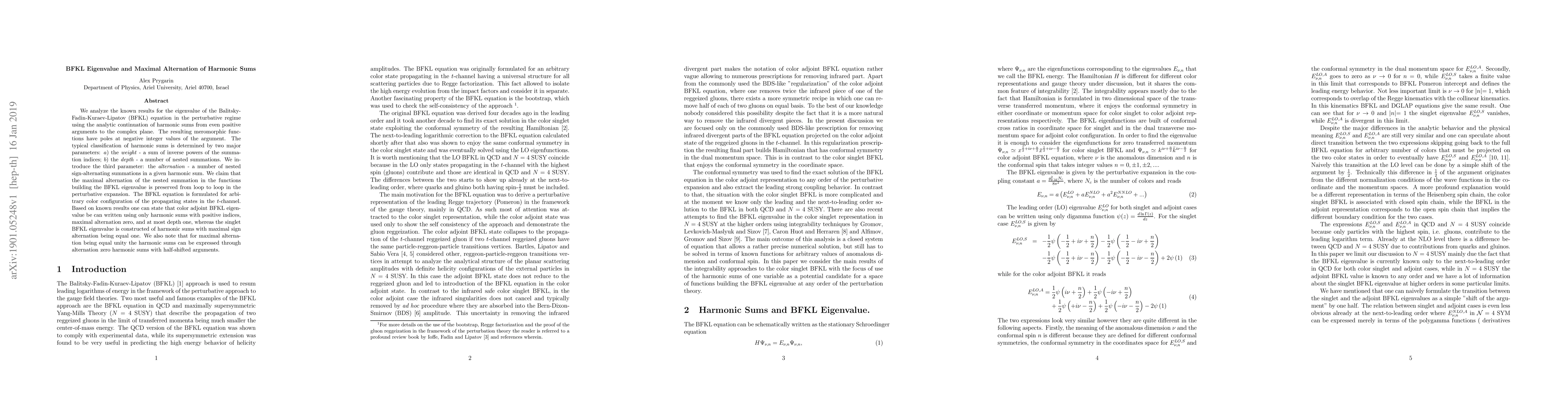 This paper investigates the BFKL eigenvalue in the perturbative regime, introducing a new parameter called "alternation" for nested sign-alternating summations. It claims that the maximal alternation is preserved across loops in the perturbative expansion, with the color adjoint BFKL eigenvalue constructed from harmonic sums with zero alternation and the singlet BFKL eigenvalue from those with maximal alternation of one.