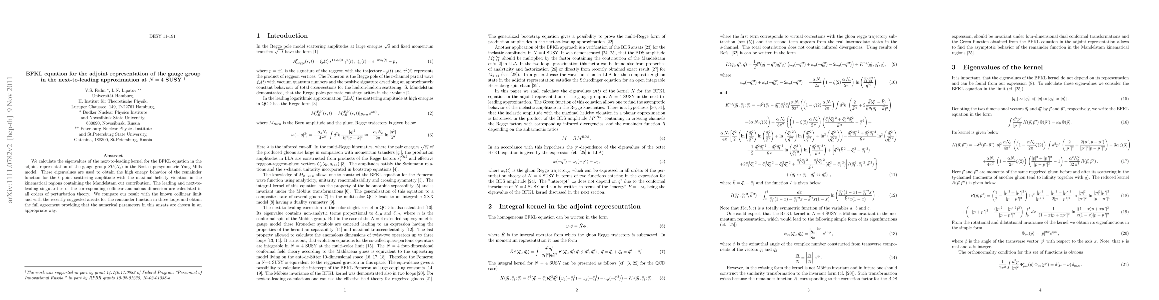 We calculate the eigenvalues of the next-to-leading kernel for the BFKL equation in the adjoint representation of the gauge group $SU(N_c)$ in the N=4 supersymmetric Yang-Mills model. These eigenvalues are used to obtain the high energy behavior of the remainder function for the 6-point scattering amplitude with the maximal helicity violation in the kinematical regions containing the Mandelstam cut contribution. The leading and next-to-leading singularities of the corresponding collinear anomalous dimension are calculated in all orders of perturbation theory. We compare our result with the known collinear limit and with the recently suggested ansatz for the remainder function in three loops and obtain the full agreement providing that the numerical parameters in this anzatz are chosen in an appropriate way.