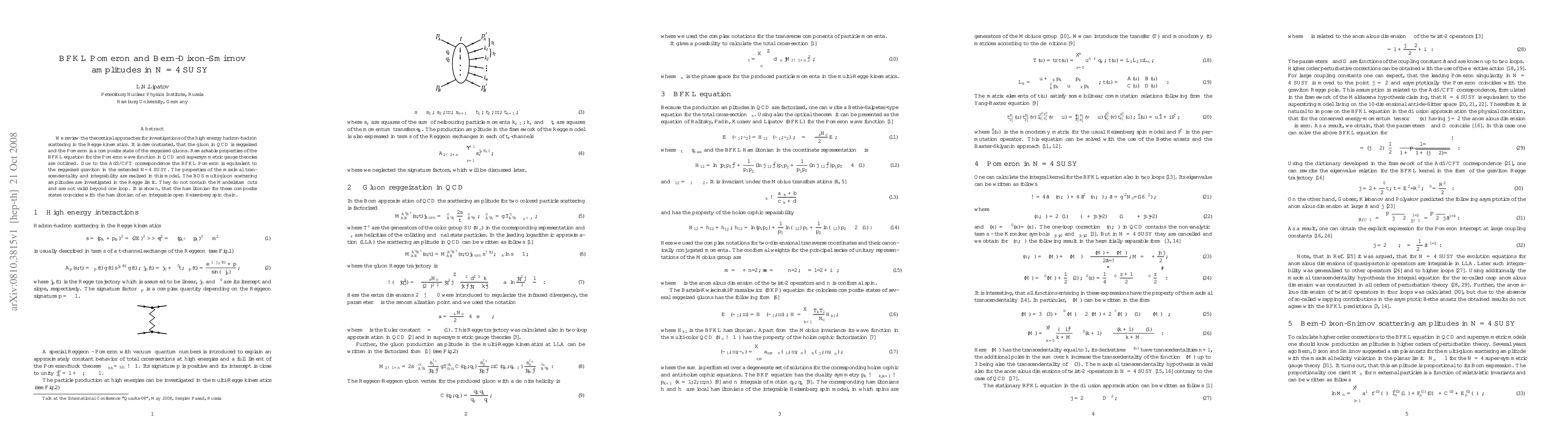 We review the theoretical approaches for investigations of the high energy hadron-hadron scattering in the Regge kinematics. It is demonstrated, that the gluon in QCD is reggeized and the Pomeron is a composite state of the reggeized gluons. Remarkable properties of the BFKL equation for the Pomeron wave function in QCD and supersymmetric gauge theories are outlined. Due to the AdS/CFT correspondence the BFKL Pomeron is equivalent to the reggeized graviton in the extended N=4 SUSY. The properties of the maximal transcendentality and integrability are realized in this model. The BDS multi-gluon scattering amplitudes are investigated in the Regge limit. They do not contain the Mandelstam cuts and are not valid beyond one loop. It is shown, that the hamiltonian for these composite states coincides with the hamiltonian of an integrable open Heisenberg spin chain.