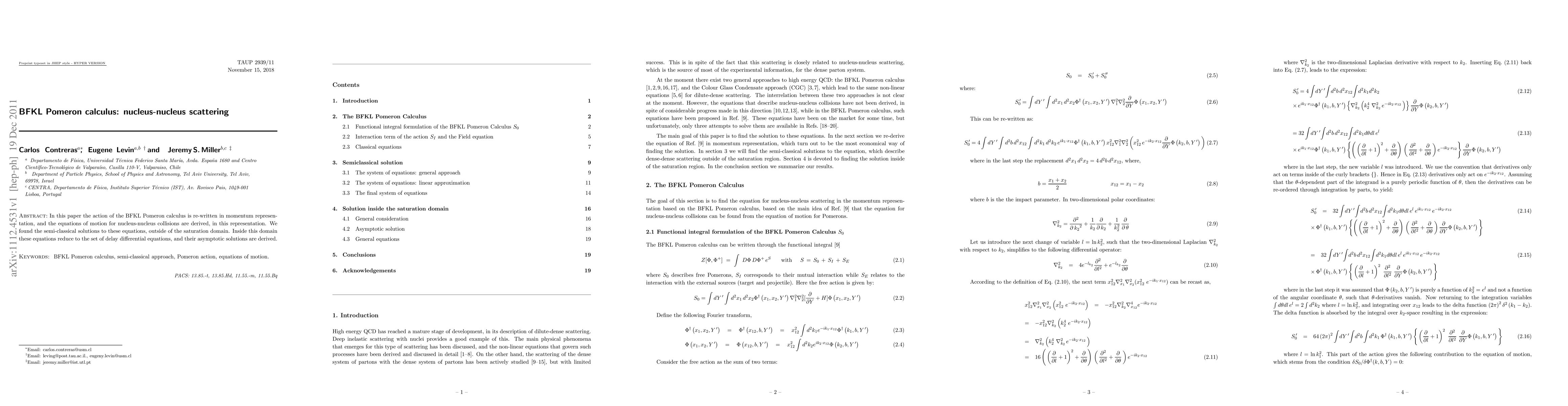 This paper reformulates the BFKL Pomeron calculus in momentum representation and derives equations for nucleus-nucleus scattering. It finds semi-classical solutions outside the saturation domain and derives asymptotic solutions for delay differential equations within the saturation domain.