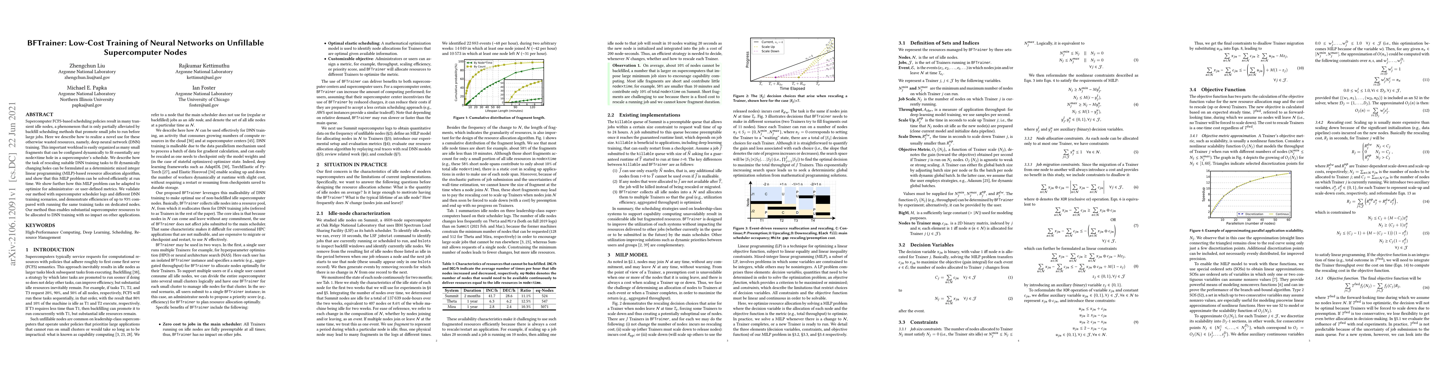BFTrainer efficiently utilizes idle supercomputer nodes by dynamically allocating deep neural network training tasks to fill scheduling gaps, formulated as a MILP-based resource allocation algorithm. This approach achieves up to 93% efficiency compared to dedicated node training, optimizing resource use without affecting other applications.