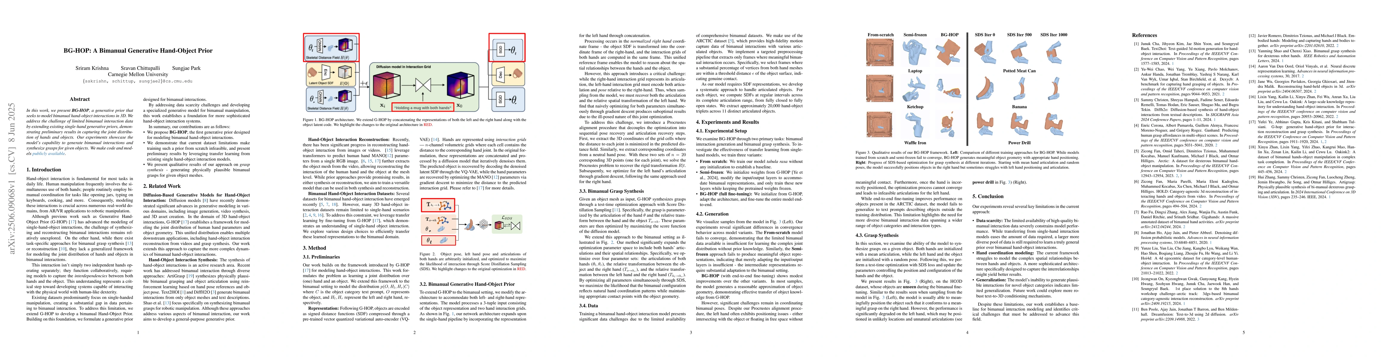This paper introduces BG-HOP, a generative prior that models bimanual hand-object interactions in 3D, allowing for the generation of realistic interactions and synthesized grasps for objects.