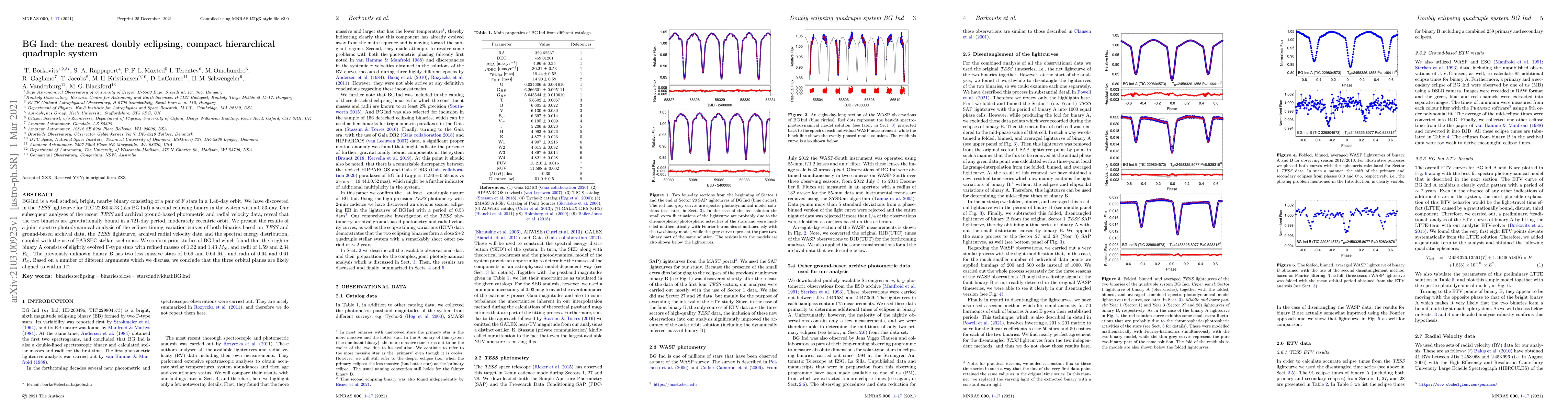 BG Ind is a nearby binary system of F stars with an additional eclipsing binary discovered within it, forming a compact quadruple system. Detailed analysis confirms the presence of two gravitationally bound binaries with orbital periods of 1.46 and 0.53 days, respectively, and a quadruple system orbital period of 721 days.
