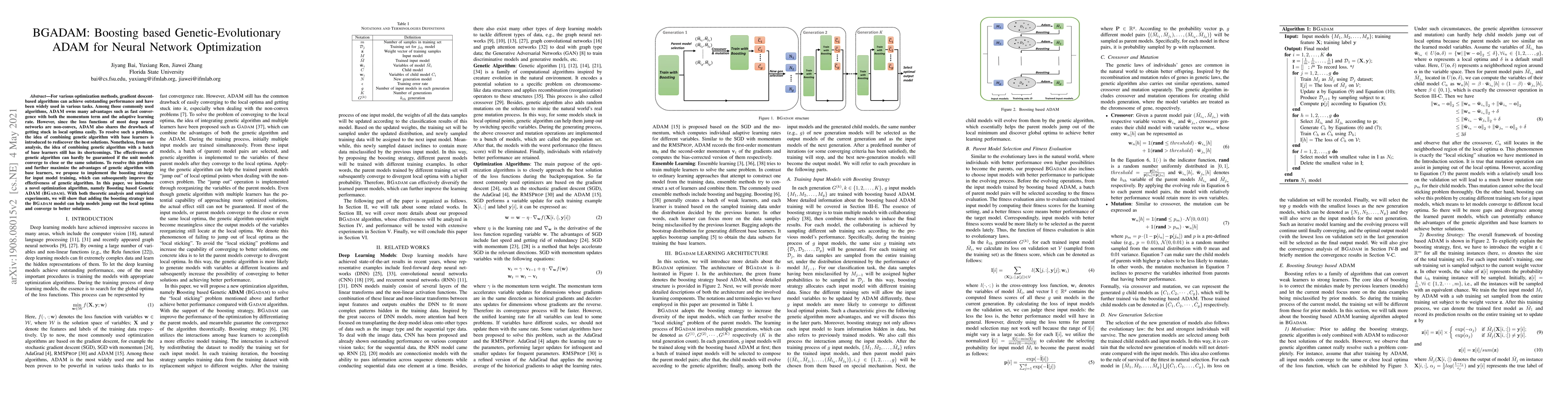 For various optimization methods, gradient descent-based algorithms can achieve outstanding performance and have been widely used in various tasks. Among those commonly used algorithms, ADAM owns many advantages such as fast convergence with both the momentum term and the adaptive learning rate. However, since the loss functions of most deep neural networks are non-convex, ADAM also shares the drawback of getting stuck in local optima easily. To resolve such a problem, the idea of combining genetic algorithm with base learners is introduced to rediscover the best solutions. Nonetheless, from our analysis, the idea of combining genetic algorithm with a batch of base learners still has its shortcomings. The effectiveness of genetic algorithm can hardly be guaranteed if the unit models converge to close or the same solutions. To resolve this problem and further maximize the advantages of genetic algorithm with base learners, we propose to implement the boosting strategy for input model training, which can subsequently improve the effectiveness of genetic algorithm. In this paper, we introduce a novel optimization algorithm, namely Boosting based Genetic ADAM (BGADAM). With both theoretic analysis and empirical experiments, we will show that adding the boosting strategy into the BGADAM model can help models jump out the local optima and converge to better solutions.