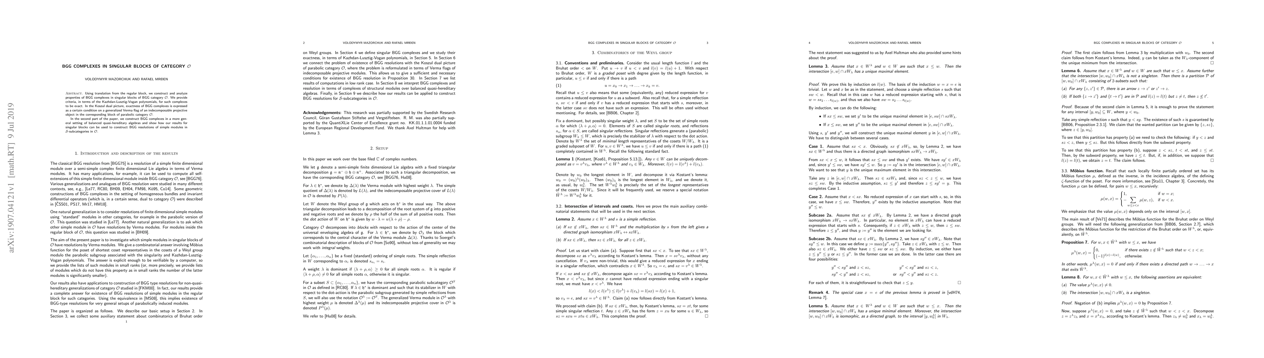 Using translation from the regular block, we construct and analyze properties of BGG complexes in singular blocks of BGG category ${\mathcal{O}}$. We provide criteria, in terms of the Kazhdan-Lusztig-Vogan polynomials, for such complexes to be exact. In the Koszul dual picture, exactness of BGG complexes is expressed as a certain condition on a generalized Verma flag of an indecomposable projective object in the corresponding block of parabolic category ${\mathcal{O}}$. In the second part of the paper, we construct BGG complexes in a more general setting of balanced quasi-hereditary algebras and show how our results for singular blocks can be used to construct BGG resolutions of simple modules in ${\mathcal{S}}$-subcategories in ${\mathcal{O}}$.