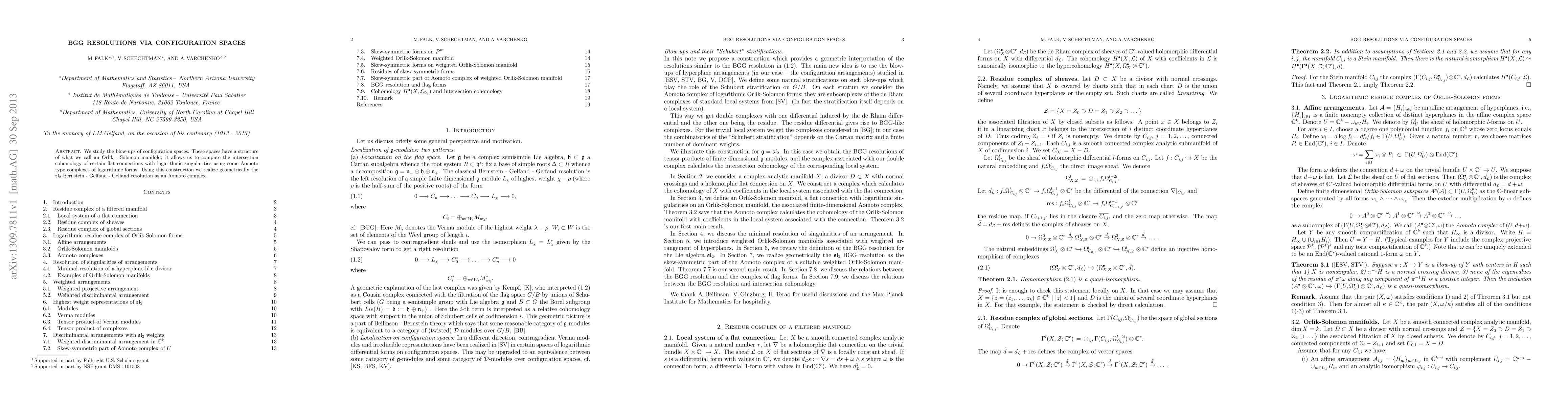 We study the blow-ups of configuration spaces. These spaces have a structure of what we call an Orlik-Solomon manifold; it allows us to compute the intersection cohomology of certain flat connections with logarithmic singularities using some Aomoto type complexes of logarithmic forms. Using this construction we realize geometrically the sl_2 Bernstein - Gelfand - Gelfand resolution as an Aomoto complex.