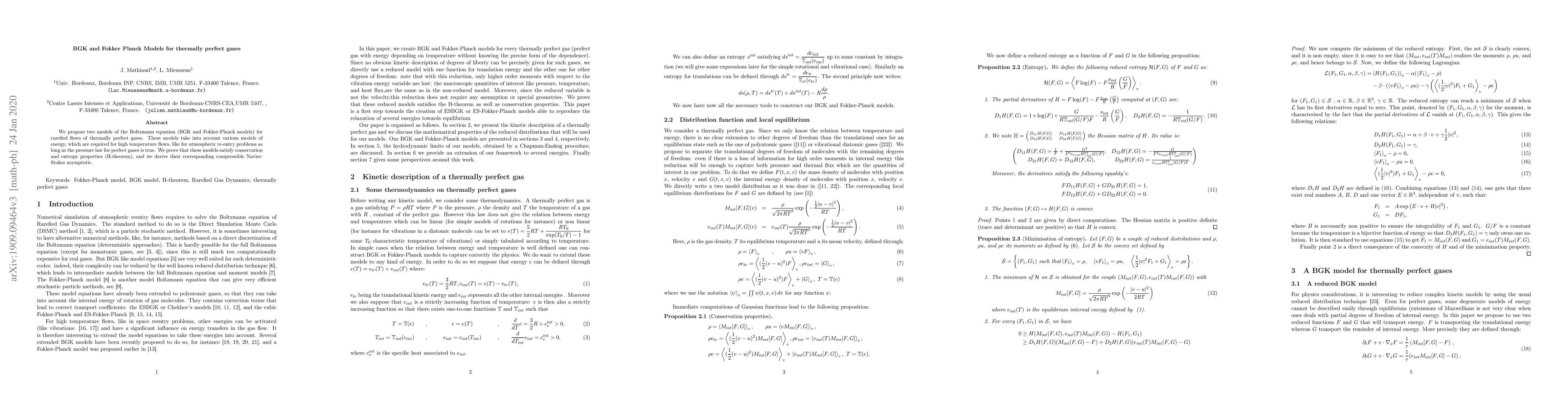 This paper proposes BGK and Fokker-Planck models for the Boltzmann equation to simulate rarefied flows of thermally perfect gases, emphasizing high-temperature applications like atmospheric re-entry. It demonstrates that these models uphold conservation and entropy properties, and derives their compressible Navier-Stokes asymptotics.