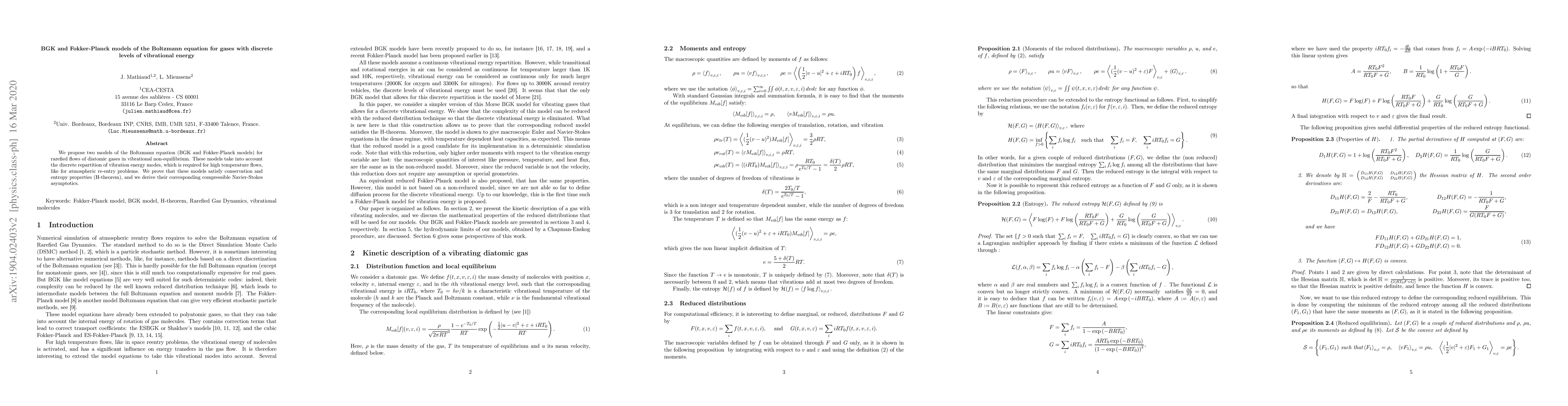 This paper proposes BGK and Fokker-Planck models for the Boltzmann equation to describe rarefied flows of diatomic gases with discrete vibrational energy levels, crucial for high-temperature scenarios like atmospheric re-entry. It demonstrates that these models uphold conservation and entropy properties, and derives their compressible Navier-Stokes asymptotics.