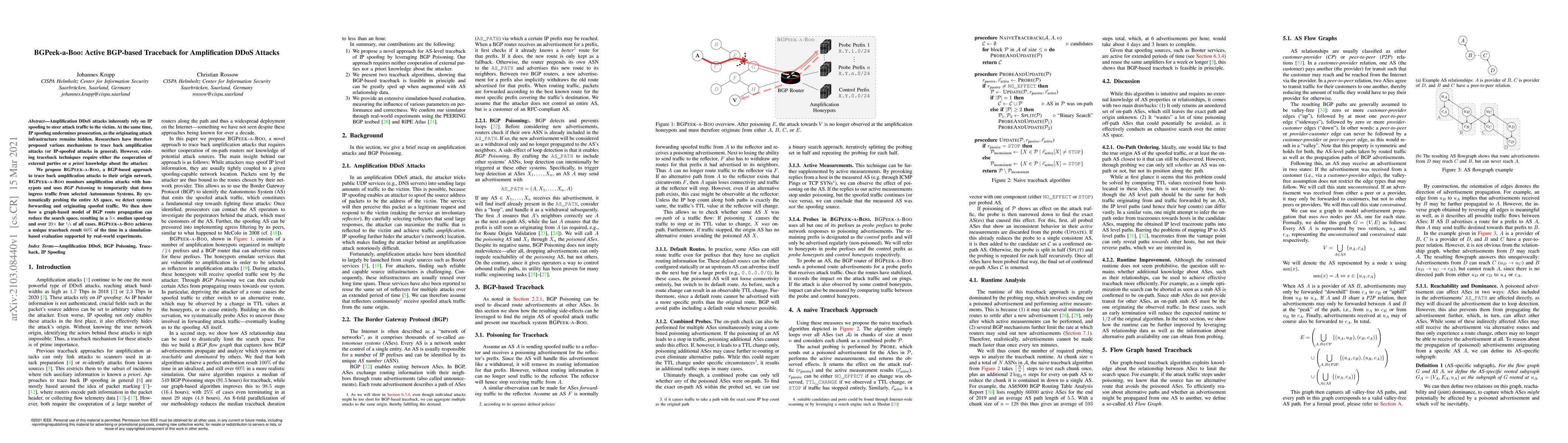 BGPeek-a-Boo proposes a BGP-based method to trace back amplification DDoS attacks, using honeypots and BGP poisoning to identify the origin network without requiring external cooperation or prior knowledge. This approach achieves a 60% success rate in simulations and real-world experiments.