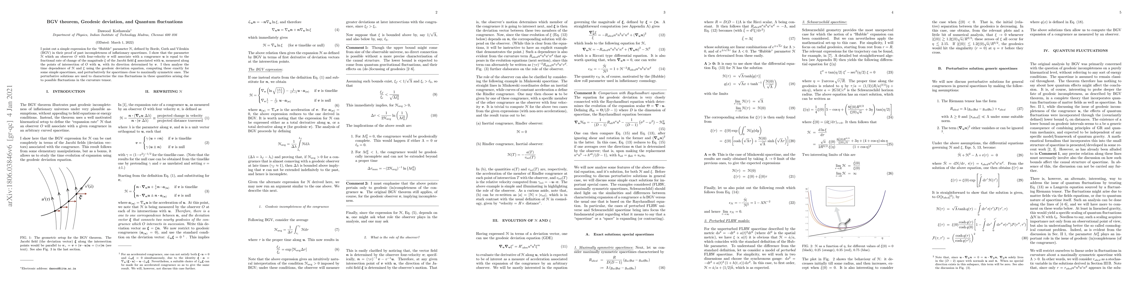 I point out a simple expression for the "Hubble" parameter $\mathscr{H}$, defined by Borde, Guth and Vilenkin (BGV) in their proof of past incompleteness of inflationary spacetimes. I show that the parameter $\mathscr{H}$ which an observer $O$ with four-velocity $\bf v$ will associate with a congruence $\bf u$ is equal to the fractional rate of change of the magnitude $\xi$ of the Jacobi field associated with $\bf u$, measured along the points of intersection of $O$ with $\bf u$, with its direction determined by $\bf v$. I then analyse the time dependence of $\mathscr{H}$ and $\xi$ using the geodesic deviation equation, computing these exactly for some simple spacetimes, and perturbatively for spacetimes close to maximally symmetric ones. The perturbative solutions are used to characterise the rms fluctuations in these quantities arising due to possible fluctuations in the curvature tensor.