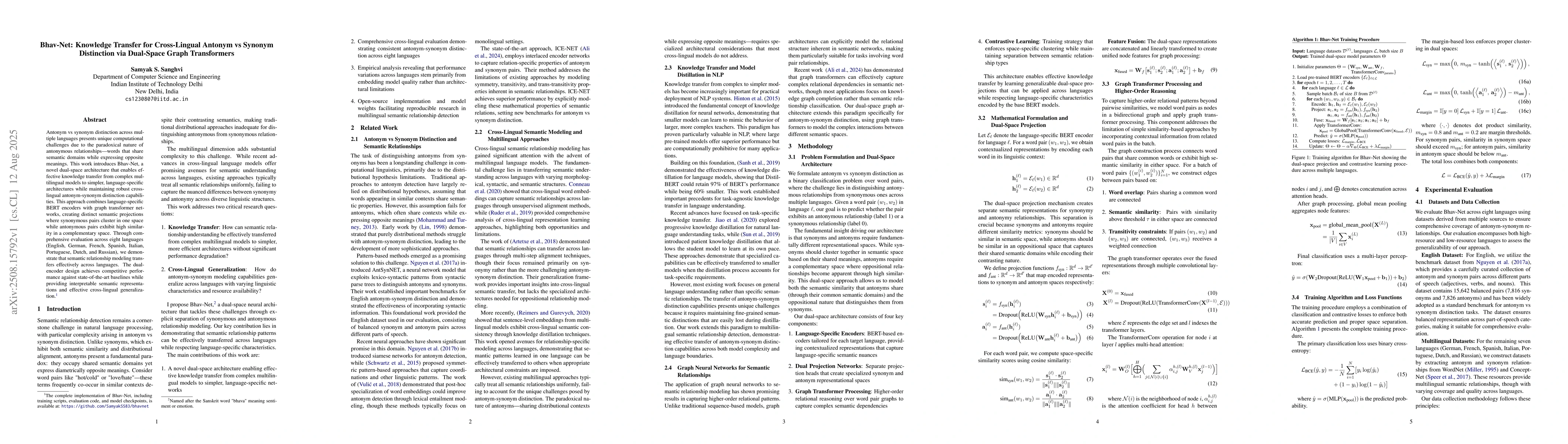 Antonym vs synonym distinction across multiple languages presents unique computational challenges due to the paradoxical nature of antonymous relationships words that share semantic domains while expressing opposite meanings. This work introduces Bhav-Net, a novel dual-space architecture that enables effective knowledge transfer from complex multilingual models to simpler, language-specific architectures while maintaining robust cross-lingual antonym--synonym distinction capabilities. Our approach combines language-specific BERT encoders with graph transformer networks, creating distinct semantic projections where synonymous pairs cluster in one space while antonymous pairs exhibit high similarity in a complementary space. Through comprehensive evaluation across eight languages (English, German, French, Spanish, Italian, Portuguese, Dutch, and Russian), we demonstrate that semantic relationship modeling transfers effectively across languages. The dual-encoder design achieves competitive performance against state-of-the-art baselines while providing interpretable semantic representations and effective cross-lingual generalization.