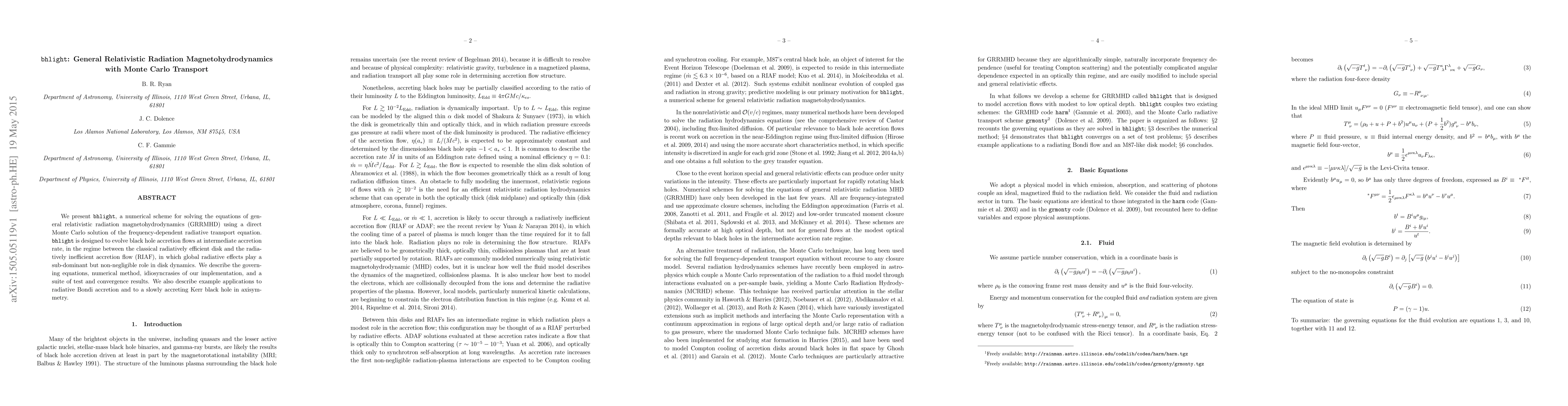 bhlight is a numerical scheme for solving general relativistic radiation magnetohydrodynamics (GRRMHD) using Monte Carlo transport methods. It is designed to model black hole accretion flows in the intermediate accretion rate regime, where global radiative effects are significant but not dominant.