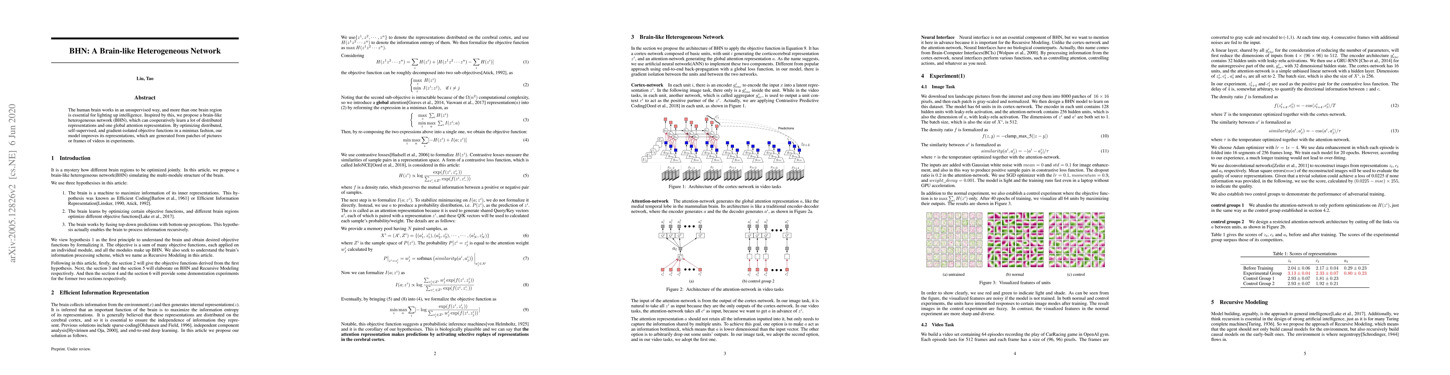 The human brain works in an unsupervised way, and more than one brain region is essential for lighting up intelligence. Inspired by this, we propose a brain-like heterogeneous network (BHN), which can cooperatively learn a lot of distributed representations and one global attention representation. By optimizing distributed, self-supervised, and gradient-isolated objective functions in a minimax fashion, our model improves its representations, which are generated from patches of pictures or frames of videos in experiments.
