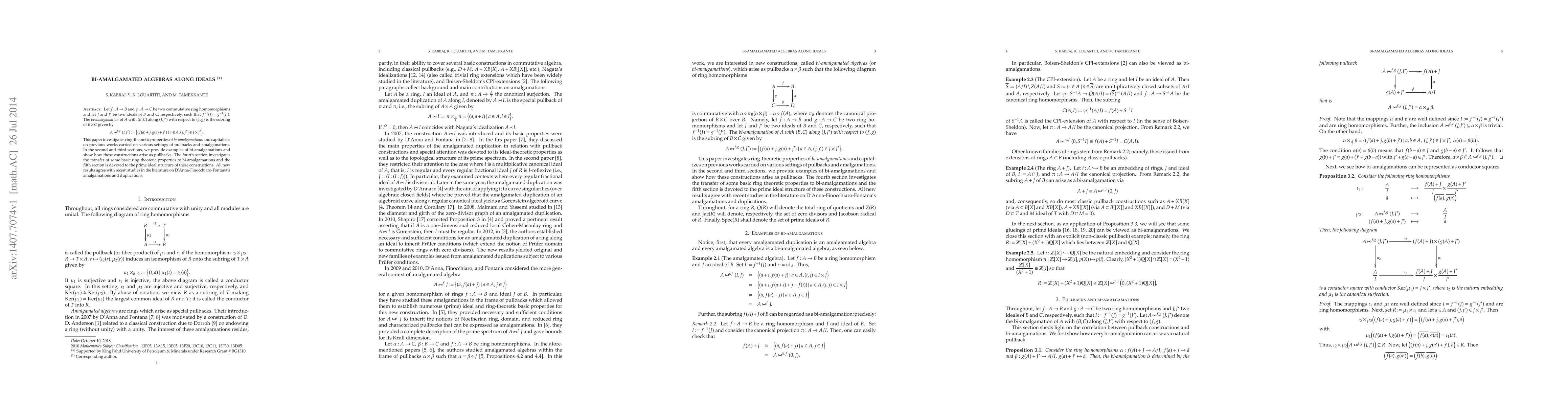 Let $f: A\rightarrow B$ and $g: A\rightarrow C$ be two commutative ring homomorphisms and let $J$ and $J'$ be two ideals of $B$ and $C$, respectively, such that $f^{-1}(J)=g^{-1}(J')$. The \emph{bi-amalgamation} of $A$ with $(B, C)$ along $(J, J')$ with respect to $(f,g)$ is the subring of $B\times C$ given by $$A\bowtie^{f,g}(J,J'):=\big\{(f(a)+j,g(a)+j') \mid a\in A, (j,j')\in J\times J'\big\}.$$ This paper investigates ring-theoretic properties of \emph{bi-amalgamations} and capitalizes on previous works carried on various settings of pullbacks and amalgamations. In the second and third sections, we provide examples of bi-amalgamations and show how these constructions arise as pullbacks. The fourth section investigates the transfer of some basic ring theoretic properties to bi-amalgamations and the fifth section is devoted to the prime ideal structure of these constructions. All new results agree with recent studies in the literature on D'Anna-Finocchiaro-Fontana's amalgamations and duplications.