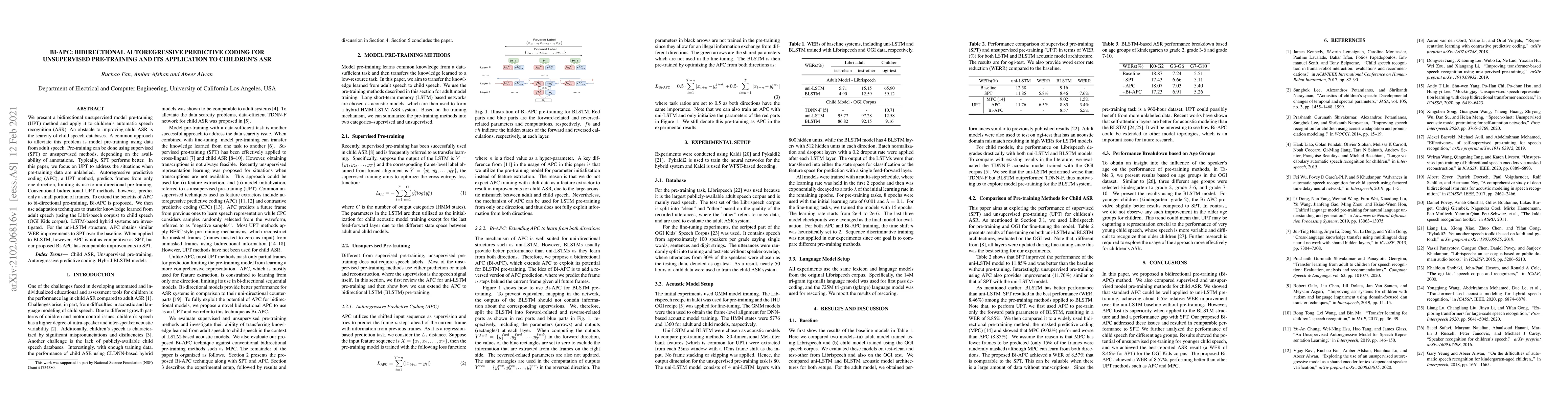 This paper introduces Bi-APC, a bidirectional autoregressive predictive coding method for unsupervised pre-training, which is applied to improve children's automatic speech recognition (ASR). The method aims to address the scarcity of labeled child speech data by leveraging pre-training with adult speech data, showing comparable improvements to supervised pre-training in LSTM-based hybrid systems.