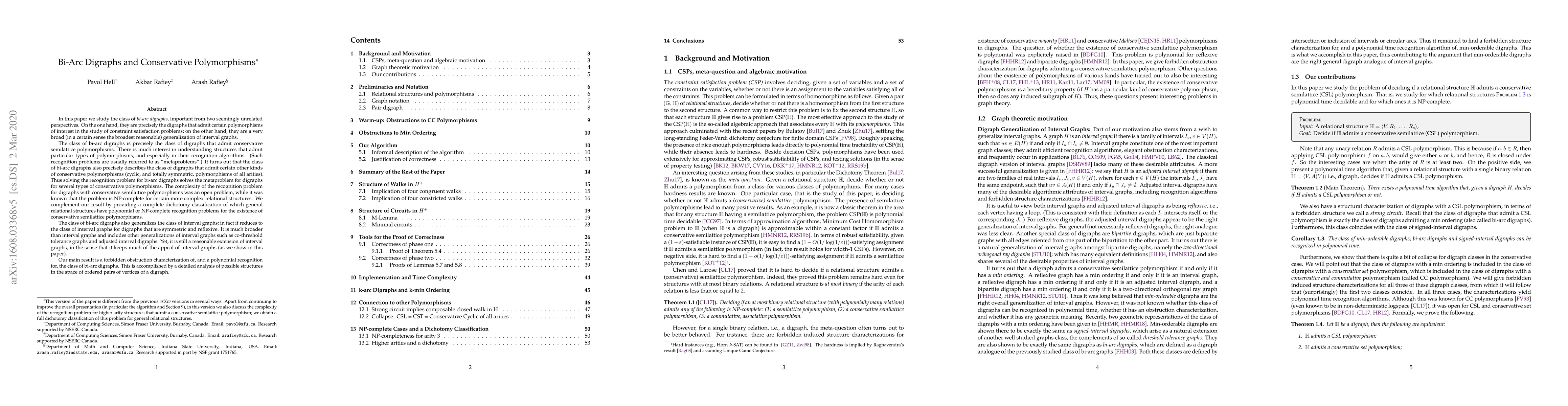 In this paper we study the class of bi-arc digraphs, important from two seemingly unrelated perspectives. On the one hand, they are precisely the digraphs that admit certain polymorphisms of interest in the study of constraint satisfaction problems; on the other hand, they are a very broad generalization of interval graphs. Bi-arc digraphs is the class of digraphs that admit conservative semilattice polymorphisms. There is much interest in understanding structures that admit particular types of polymorphisms, and especially in their recognition algorithms. (Such problems are referred to as metaproblems.) Surprisingly, the class of bi-arc digraphs also describes the class of digraphs that admit certain other kinds of conservative polymorphisms. Thus solving the recognition problem for bi-arc digraphs solves the metaproblem for digraphs for several types of conservative polymorphisms. The complexity of the recognition problem for digraphs with conservative semilattice polymorphisms was an open problem, while it was known to be NP-complete for certain more complex relational structures. We complement our result by providing a complete dichotomy classification of which general relational structures have polynomial or NP-complete recognition problems for the existence of conservative semilattice polymorphisms. Bi-arc digraphs also generalizes the class of interval graphs; in fact it reduces to the class of interval graphs for symmetric and reflexive digraphs. It is much broader than interval graphs and includes other generalizations of interval graphs such as co-threshold tolerance graphs and adjusted interval digraphs. Yet, it is still a reasonable extension of interval graphs, in the sense that it keeps much of the appeal of interval graphs. Our main result is a forbidden obstruction characterization of, and a polynomial recognition for, the class of bi-arc digraphs.