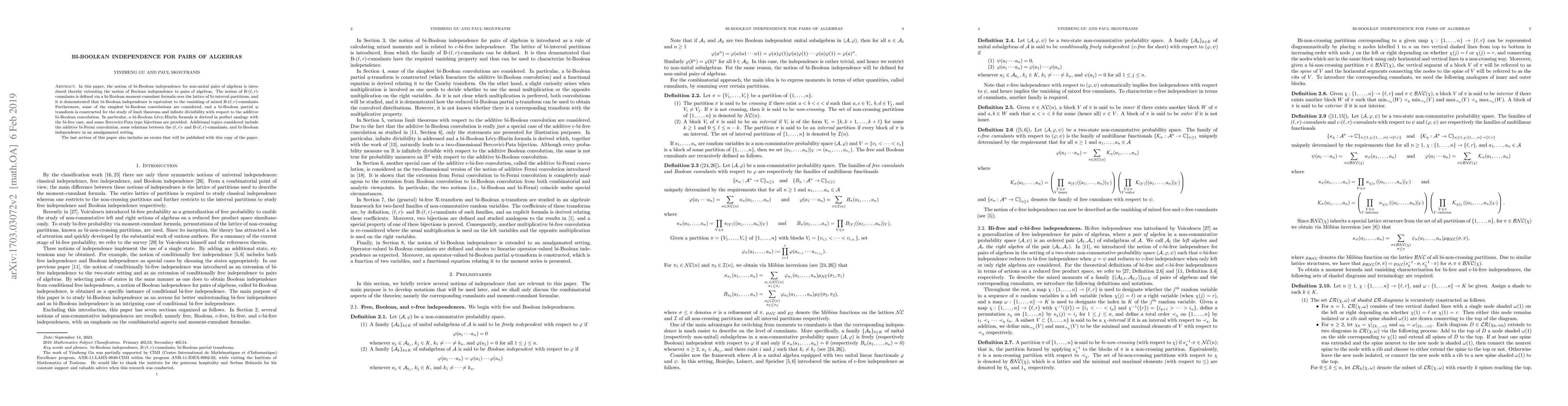 This paper introduces bi-Boolean independence for non-unital pairs of algebras, extending Boolean independence, and defines B-$(\ell, r)$-cumulants via a bi-Boolean moment-cumulant formula. It demonstrates that bi-Boolean independence corresponds to the vanishing of mixed B-$(\ell, r)$-cumulants and explores bi-Boolean convolutions and partial $\eta$-transforms for limit theorems and infinite divisibility.