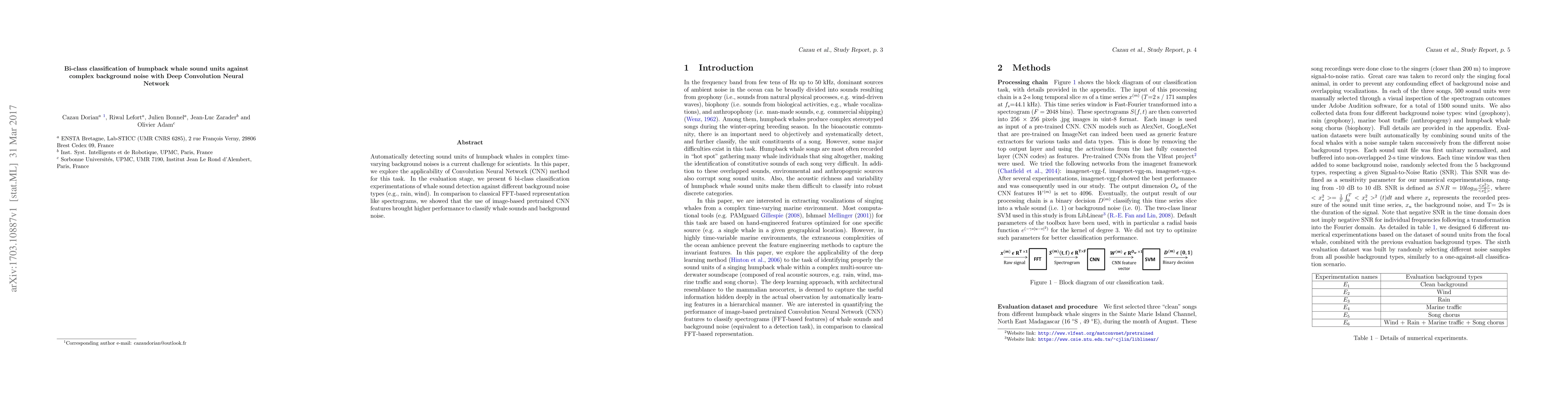 A study uses deep convolutional neural networks to improve humpback whale sound detection in complex background noises, achieving higher performance than traditional spectrogram-based methods.