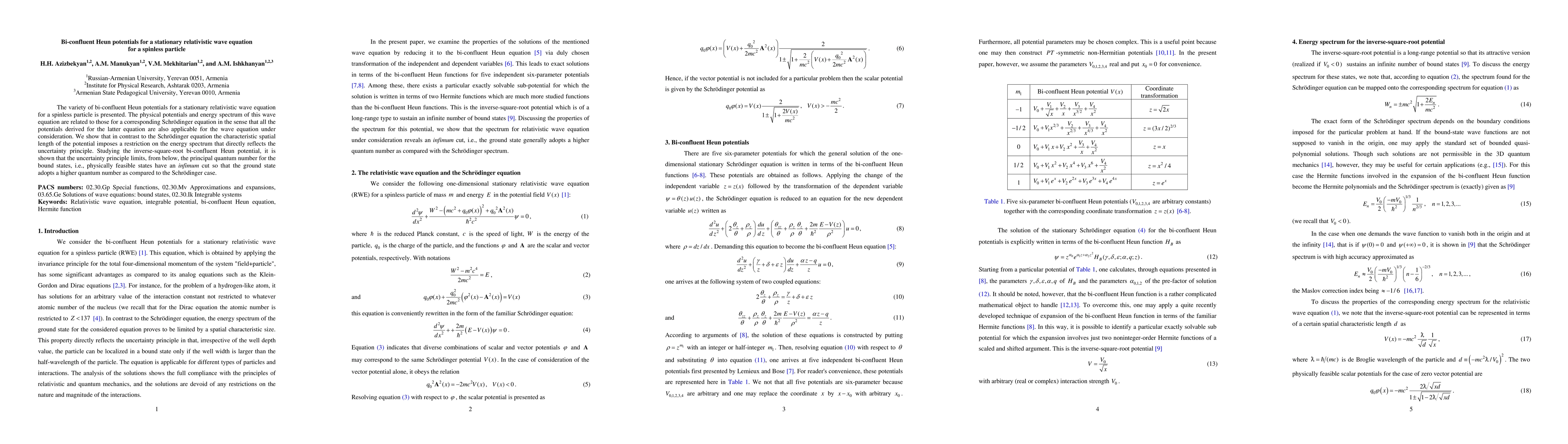 The variety of bi-confluent Heun potentials for a stationary relativistic wave equation for a spinless particle is presented. The physical potentials and energy spectrum of this wave equation are related to those for a corresponding Schr\"odinger equation in the sense that all the potentials derived for the latter equation are also applicable for the wave equation under consideration. We show that in contrast to the Schr\"odinger equation the characteristic spatial length of the potential imposes a restriction on the energy spectrum that directly reflects the uncertainty principle. Studying the inverse-square-root bi-confluent Heun potential, it is shown that the uncertainty principle limits, from below, the principal quantum number for the bound states, i.e., physically feasible states have an infimum cut so that the ground state adopts a higher quantum number as compared to the Schr\"odinger case.