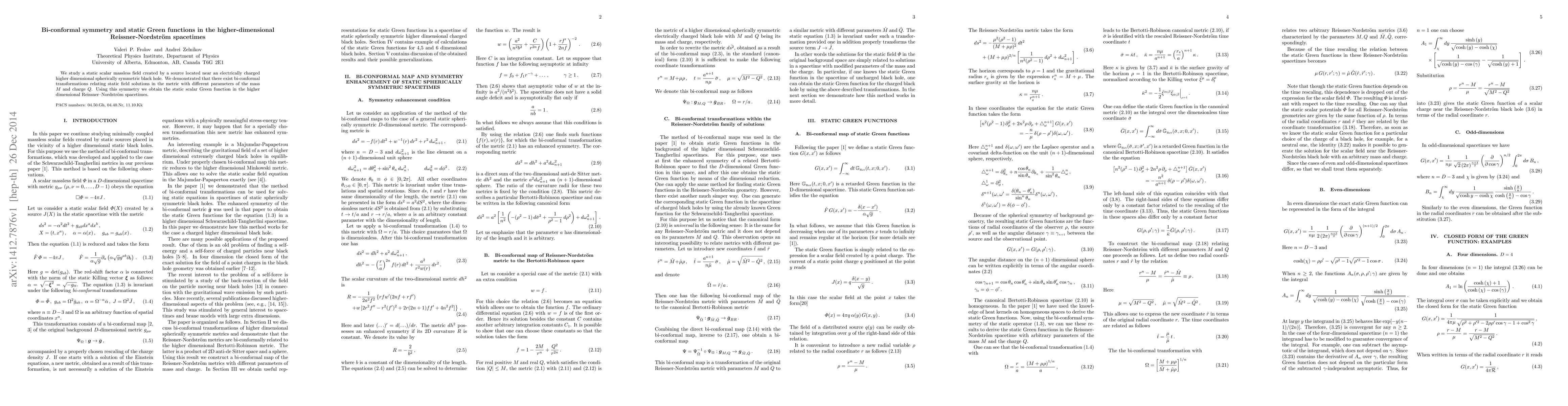 The paper explores bi-conformal symmetry in higher-dimensional Reissner-Nordstrom black hole spacetimes, revealing a transformation linking static scalar field solutions with varying mass and charge parameters. This symmetry is utilized to derive the static scalar Green function in these spacetimes.