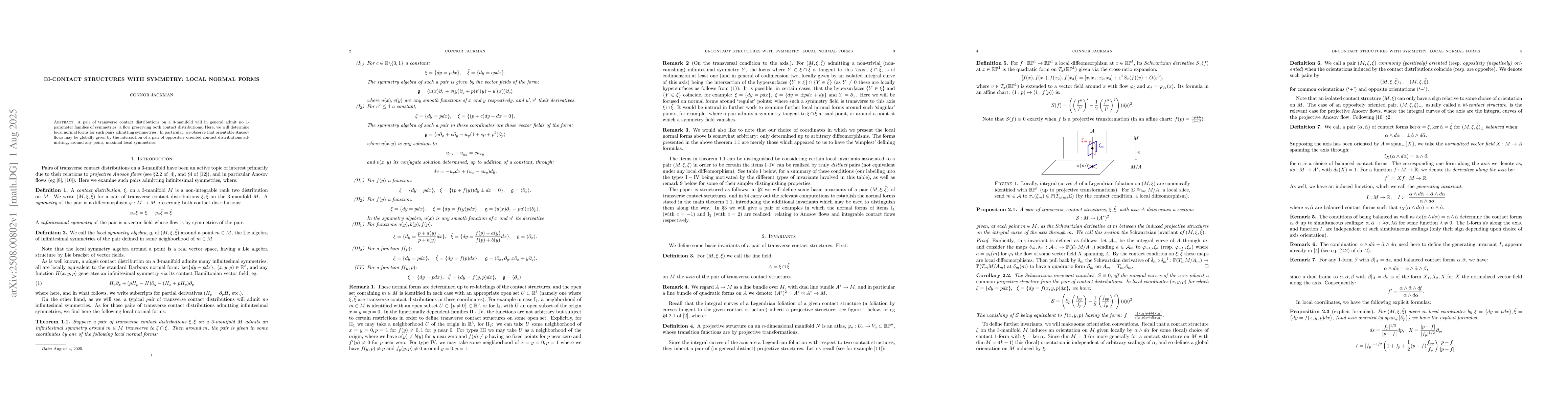 A pair of transverse contact distributions on a 3-manifold will in general admit no 1-parameter families of symmetries: a flow preserving both contact distributions. Here, we will determine local normal forms for such pairs admitting symmetries. In particular, we observe that orientable Anosov flows may be globally given by the intersection of a pair of oppositely oriented contact distributions admitting, around any point, maximal local symmetries.