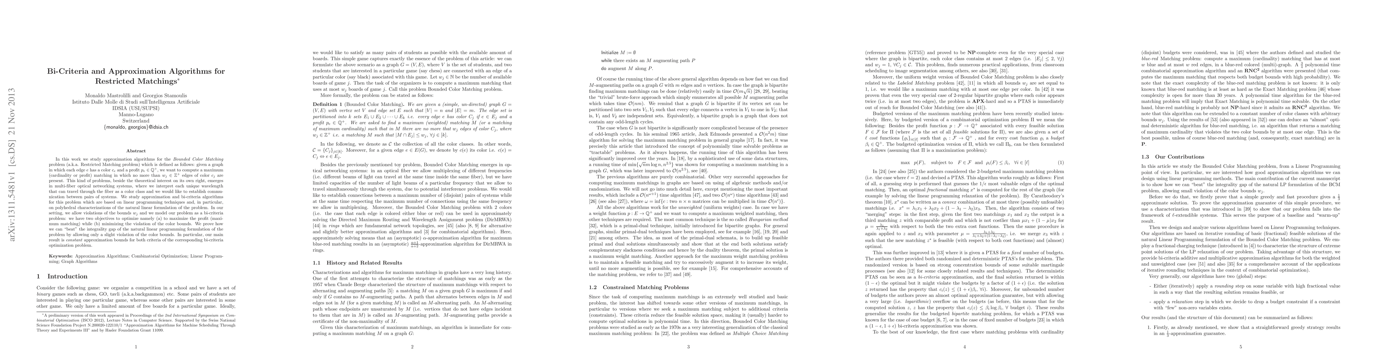 In this work we study approximation algorithms for the \textit{Bounded Color Matching} problem (a.k.a. Restricted Matching problem) which is defined as follows: given a graph in which each edge $e$ has a color $c_e$ and a profit $p_e \in \mathbb{Q}^+$, we want to compute a maximum (cardinality or profit) matching in which no more than $w_j \in \mathbb{Z}^+$ edges of color $c_j$ are present. This kind of problems, beside the theoretical interest on its own right, emerges in multi-fiber optical networking systems, where we interpret each unique wavelength that can travel through the fiber as a color class and we would like to establish communication between pairs of systems. We study approximation and bi-criteria algorithms for this problem which are based on linear programming techniques and, in particular, on polyhedral characterizations of the natural linear formulation of the problem. In our setting, we allow violations of the bounds $w_j$ and we model our problem as a bi-criteria problem: we have two objectives to optimize namely (a) to maximize the profit (maximum matching) while (b) minimizing the violation of the color bounds. We prove how we can "beat" the integrality gap of the natural linear programming formulation of the problem by allowing only a slight violation of the color bounds. In particular, our main result is \textit{constant} approximation bounds for both criteria of the corresponding bi-criteria optimization problem.