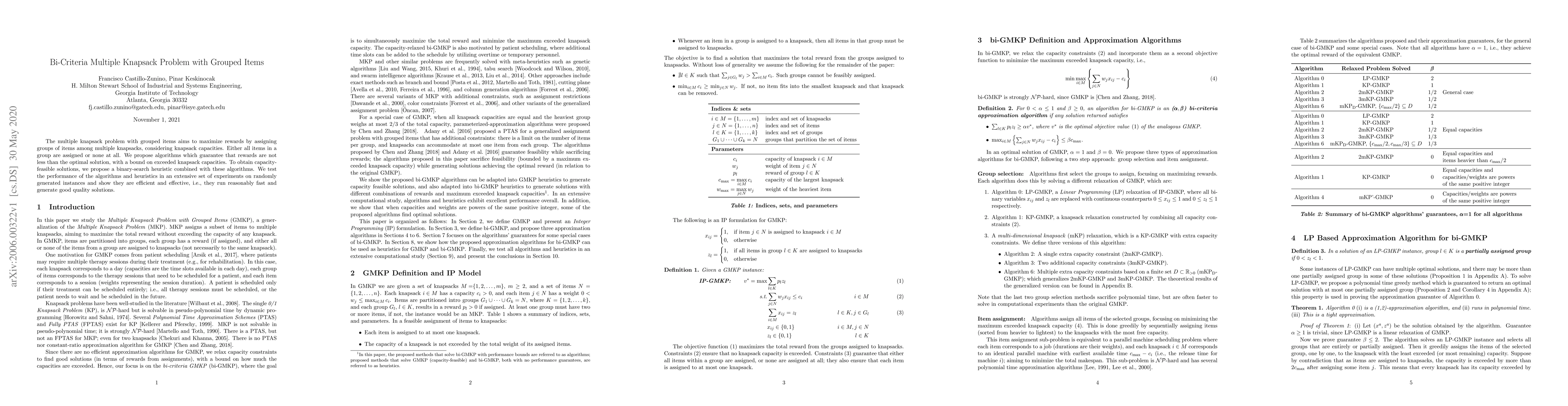 This paper proposes algorithms for the bi-criteria multiple knapsack problem with grouped items, ensuring optimal rewards and bounded exceeded capacities. A binary-search heuristic is introduced for capacity-feasible solutions, which is tested efficiently and effectively on randomly generated instances.