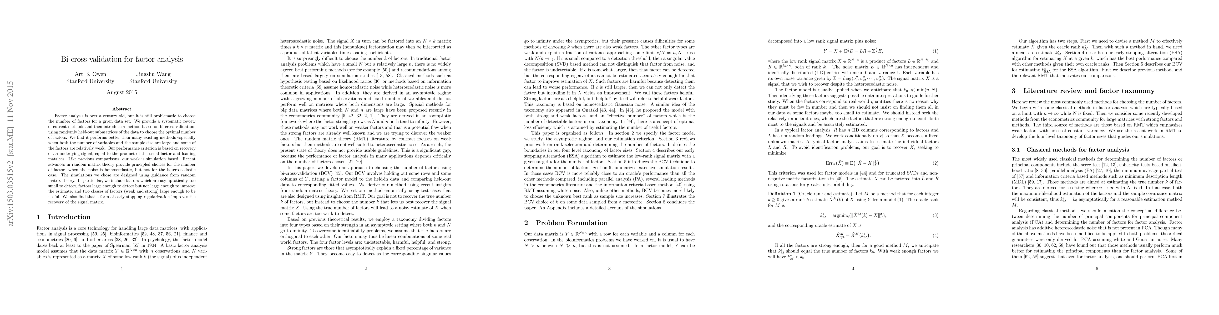 A new method called bi-cross-validation is introduced to choose the number of factors in factor analysis, outperforming traditional methods like parallel analysis and Kaiser's rule.